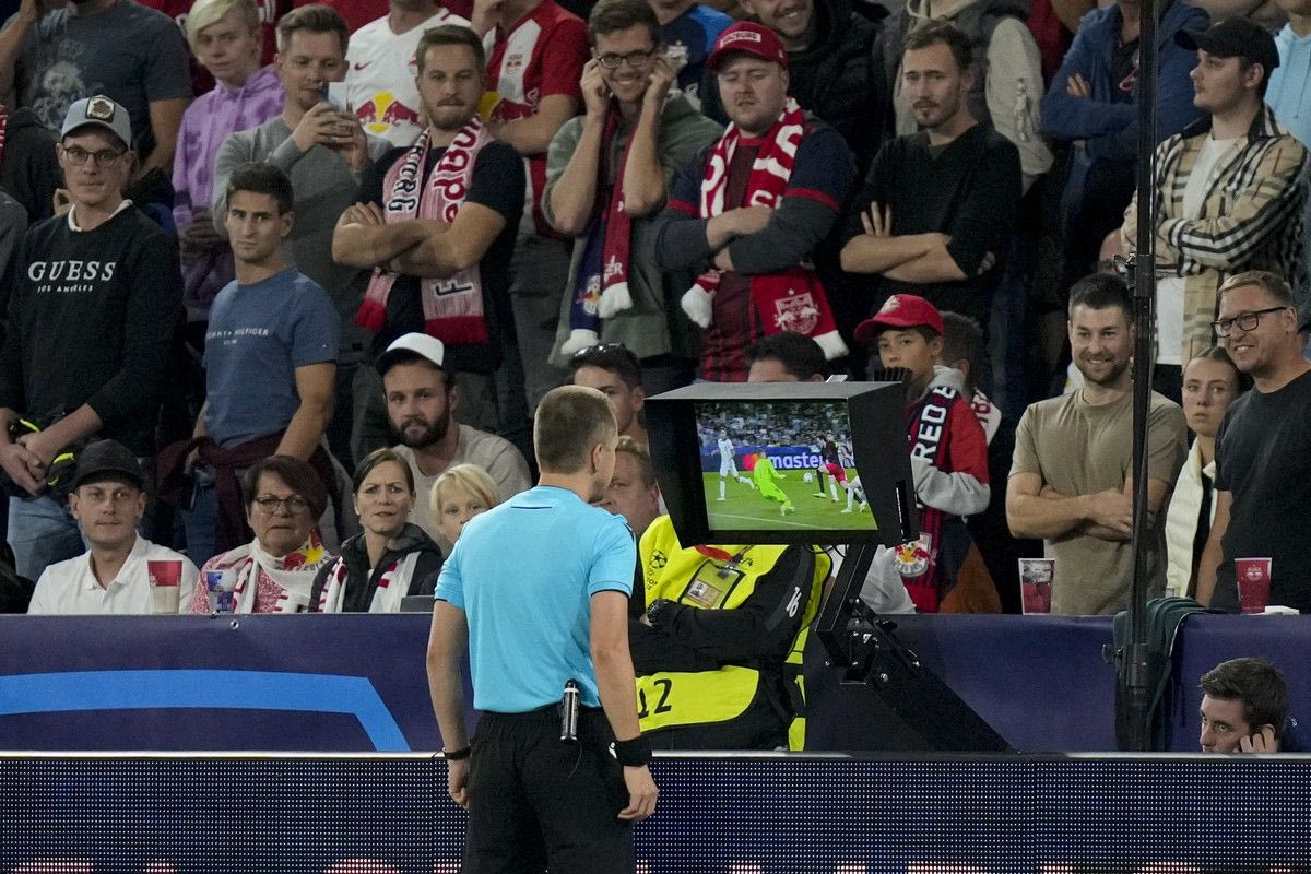 Referee Bartosz Frankowski reviews a possible penalty situation for FC Salzburg during the Champions League group D soccer match between FC Salzburg and Real Sociedad at the Salzburg stadium in Salzburg, Austria, Tuesday, Oct. 3, 2023. (AP Photo/Matthias Schrader) AP