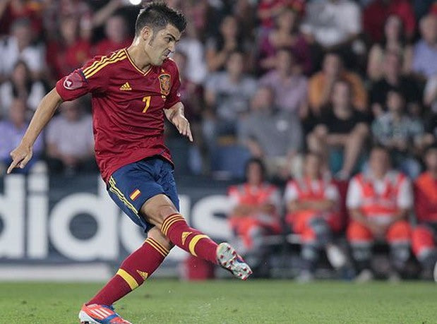 Spain's David Villa scores from a penalty kick during a friendly soccer match against Saudi Arabia at the Pasaron stadium in Pontevedra, north western Spain, Friday Sept. 7, 2012. (AP Photos/Lalo R. Villar) Spain Soccer
