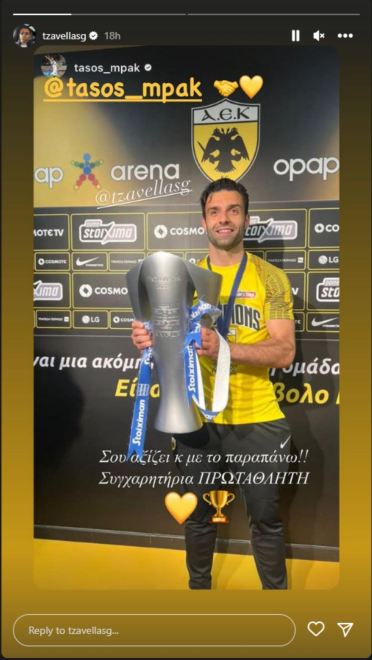 Ο Τάσος Μπακασέτας δημοσίευσε στο προφίλ του στο instagram ένα story με φωτογραφία του Γιώργου Τζαβέλλα με το τρόπαιο που κατέκτησε η ΑΕΚ.