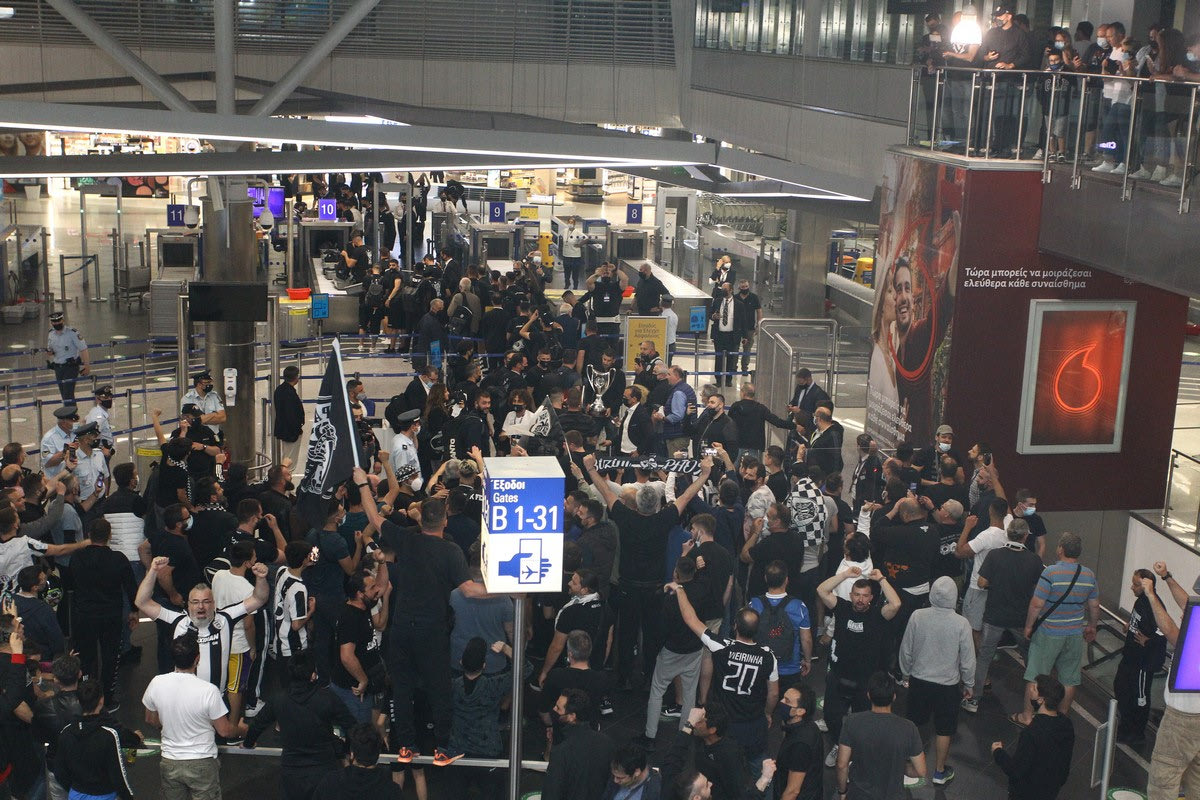 Οι φίλοι του ΠΑΟΚ κατέκλησαν το Ελευθέριος Βενιζέλος προκειμένου να πανηγυρίσουν με την αποστολή της ομάδας την κατάκτηση του κυπέλλου, λίγο πριν αναχωρήσει για τη Θεσσαλονίκη.