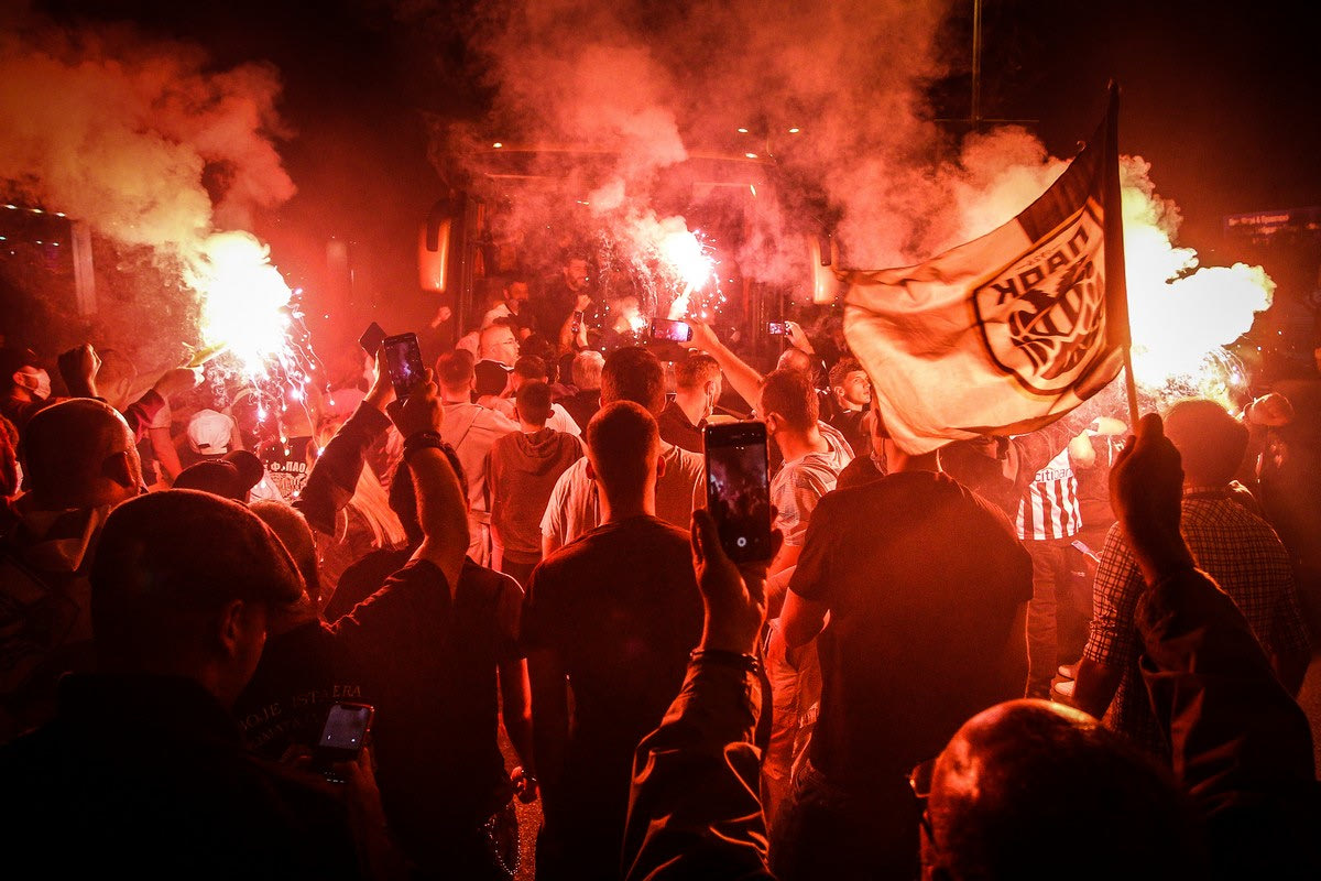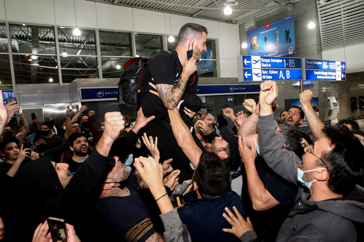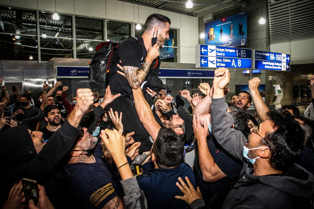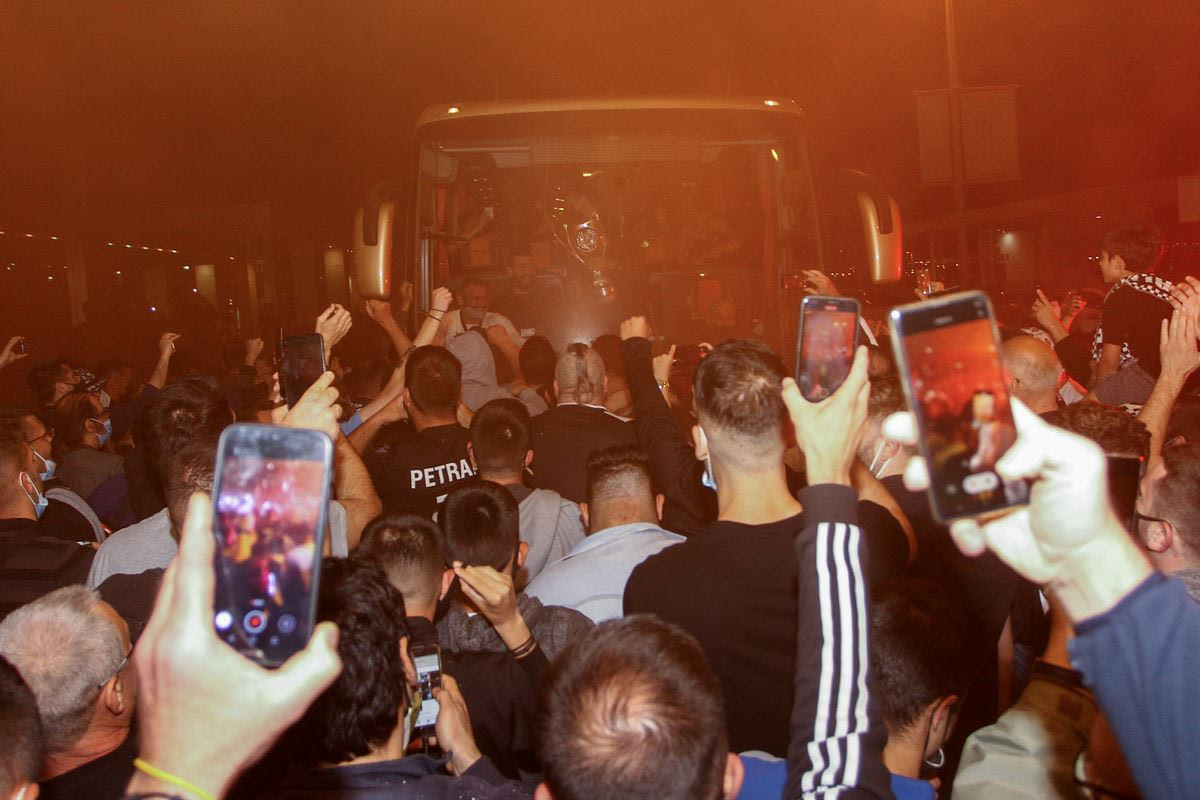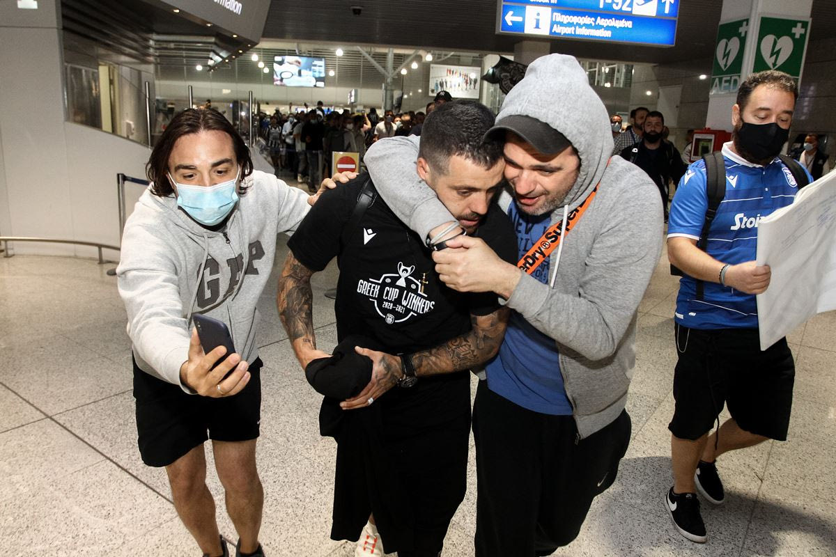 Φίλοι του ΠΑΟΚ πανηγυρίζουν με τους παίκτες στο αεροδρόμιο "Ελευθέριος Βενιζέλος" την κατάκτηση του Κυπέλλου Ελλάδας | Σάββατο 22 Μαΐου 2021