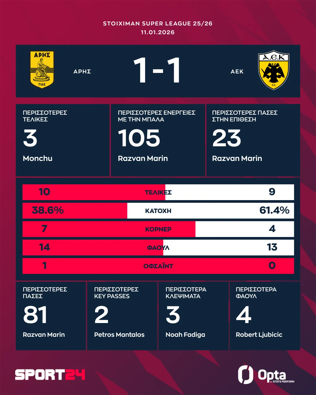 Η ΑΕΚ γκρεμίστηκε από την κορυφή της Stoiximan Super League, καθώς μαζί με τον Άρη πήραν τον βαθμό χάρη στο ισόπαλο 1-1. Ο Κοϊτά άνοιξε το σκορ στο όγδοο λεπτό και ο Γένσεν ισοφάρισε για τους Θεσσαλονικείς. Τέλος στο σερί νικών της Ένωσης που έχτισε μέσα στο 2025.