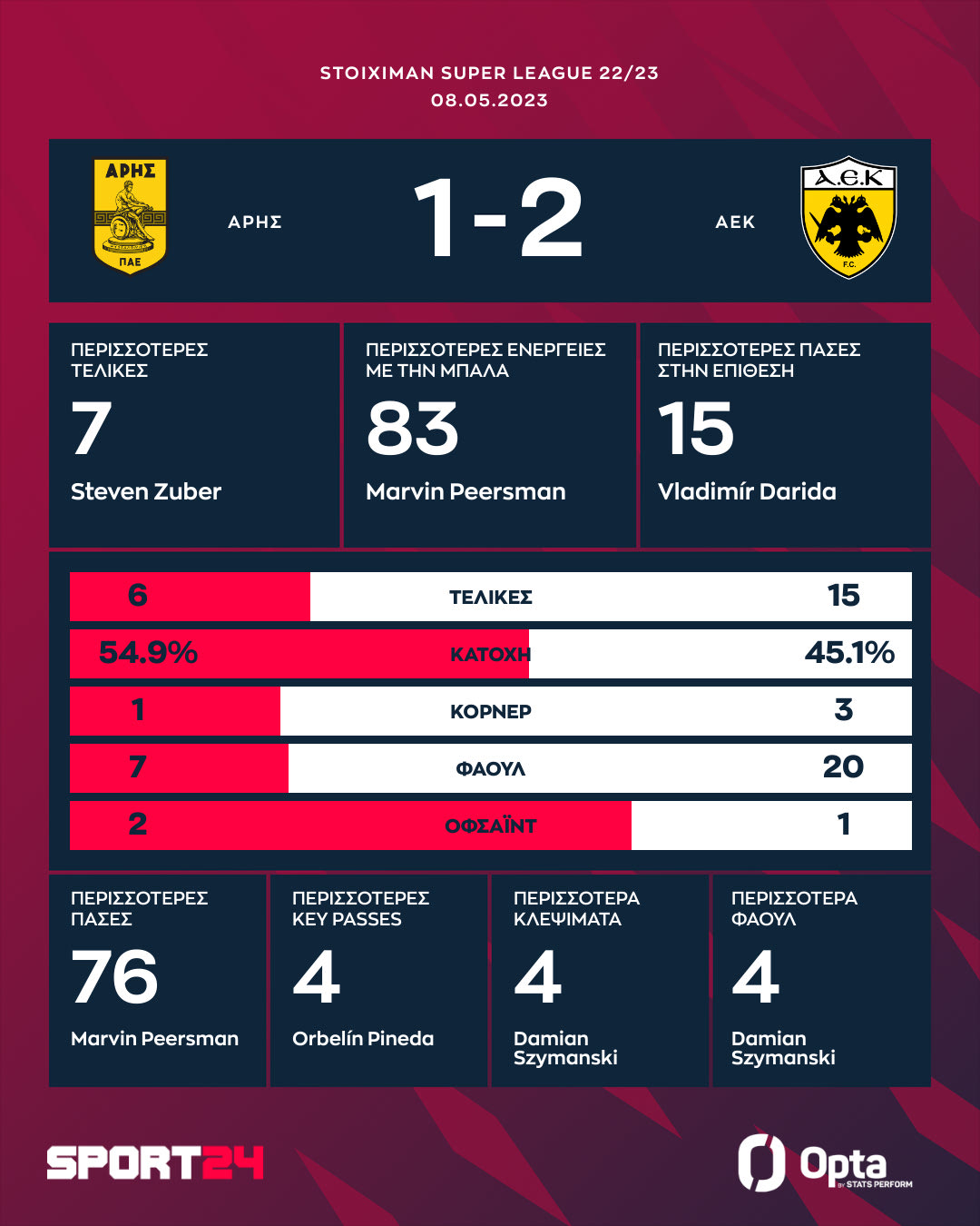 Η ΑΕΚ πέρασε από το Κλεάνθης Βικελίδης με ανατροπή από το πρώτο ημίχρονο, επικρατώντας 2-1. Ο Άρης πήρε προβάδισμα με το πέναλτι του Γκρέι στο 17′, όμως ο Φαν Βέερτ στο 22′ και ο Τσούμπερ στο 43′ διαμόρφωσαν το σκορ για τους κιτρινόμαυρους, που ήταν φουριόζοι για 45 λεπτά.