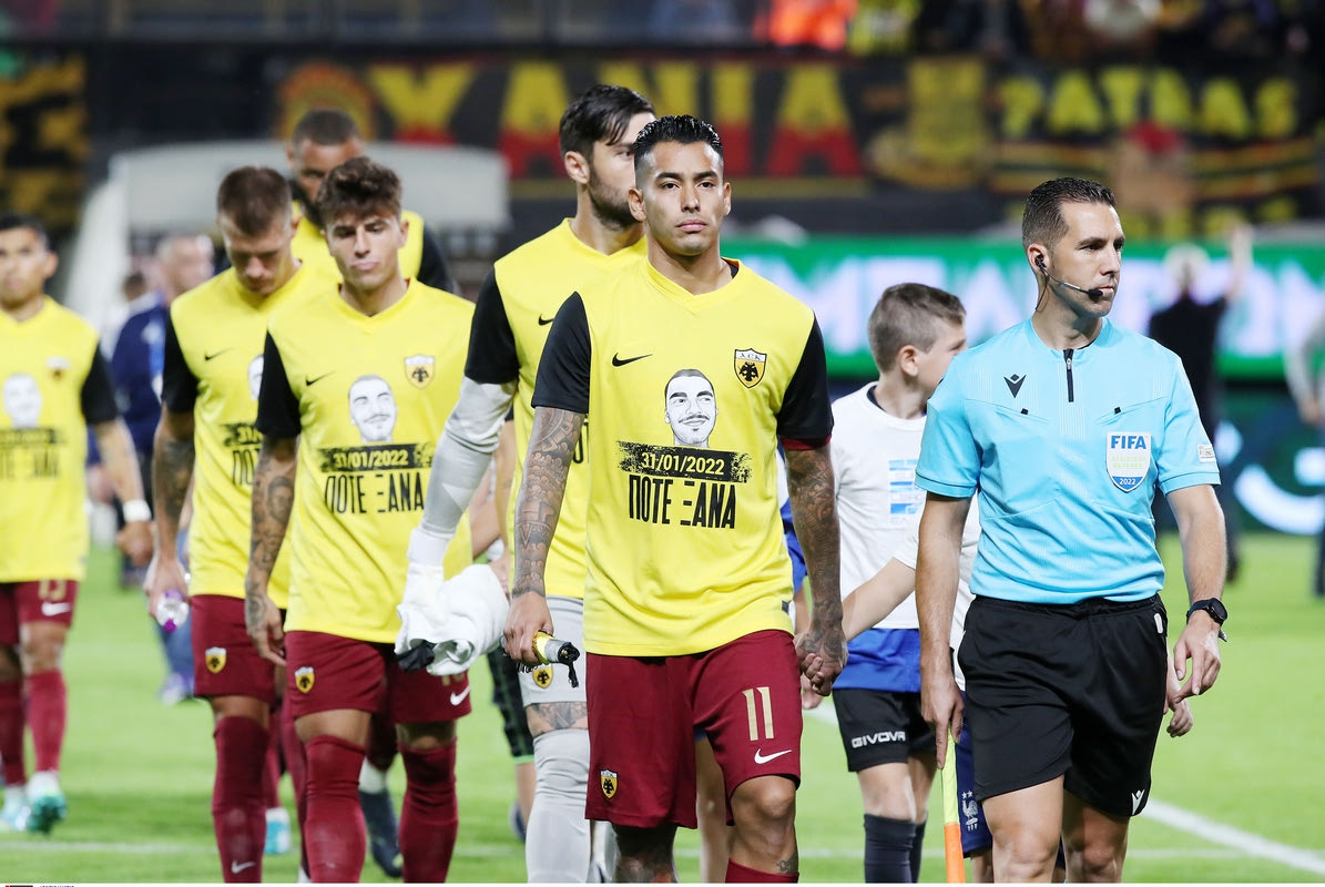 Οι παίκτες της ΑΕΚ έκαναν την εμφάνισή τους στον αγωνιστικό χώρο απέναντι στον Άρη με μπλουζάκια αφιερωμένα στην μνήμη του Άλκη Καμπανού και το μήνυμα "ποτέ ξανά".