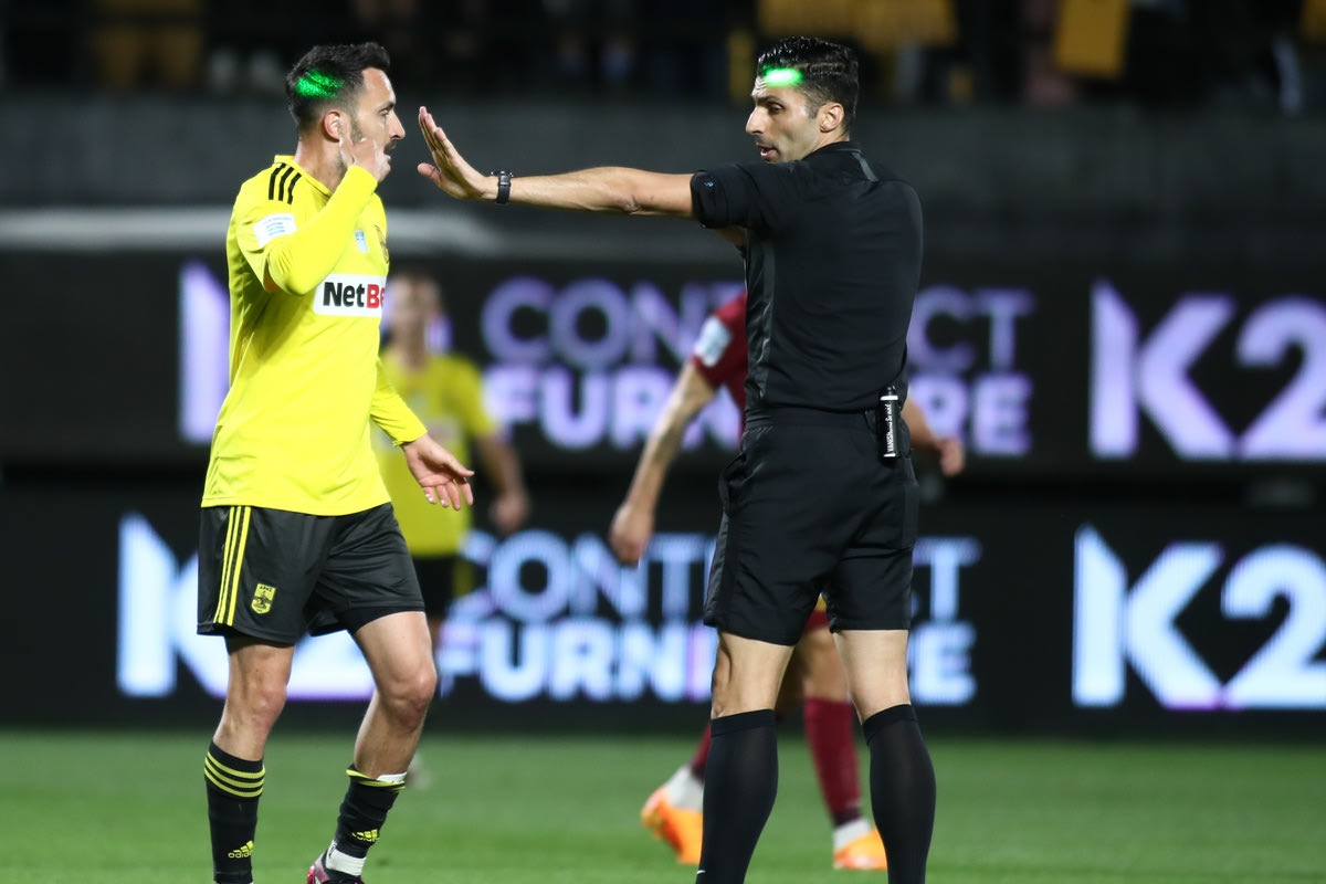 Ο διαιτητής Φωτιάς σε συνεννόηση με τον VAR για τη φάση του Πινέδα με τον Ματέο Γκαρσία
