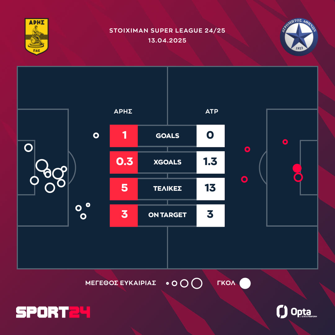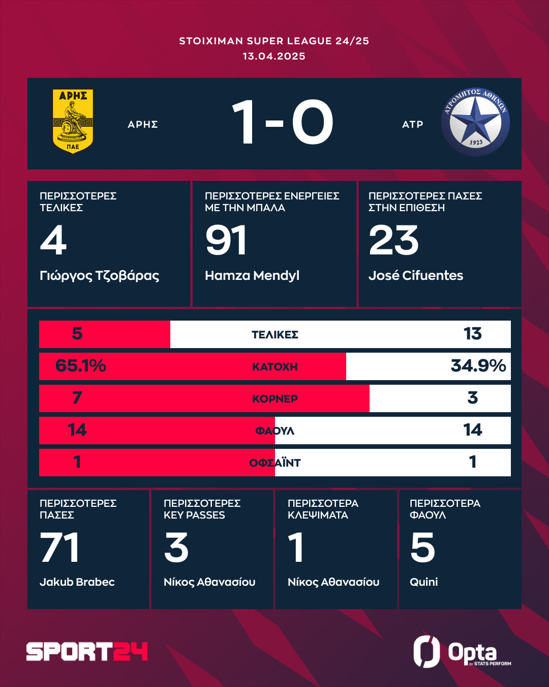 Στο 90+4′ ο Ατρόμητος είχε τη μεγαλύτερη ευκαιρία του στο παιχνίδι, που ήταν μάλιστα διπλή, όμως ο Κουέστα απέκρουσε αρχικά ηρωικά το πλασέ του Μπάκου και στη συνέχεια ο Παλμεζάνο αστόχησε μπροστά σε σχεδόν ανυπεράσπιστη εστία, για να μείνει το 1-0 και να παραμείνει ο Άρης “καβάλα στο άλογο” στη μάχη για την ευρωπαϊκή έξοδο.