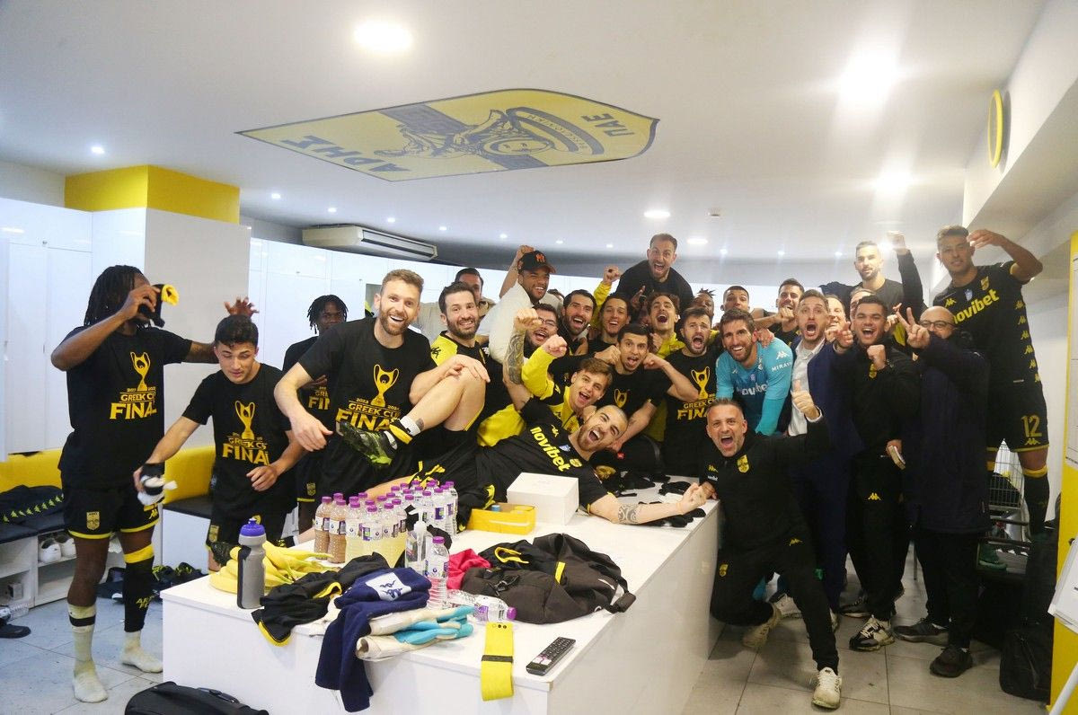 Το γλέντι μεταφέρθηκε και στα αποδυτήρια, με τους ποδοσφαιριστές του Άρη να στήνουν πάρτι για την μεγάλη τους επιτυχία.