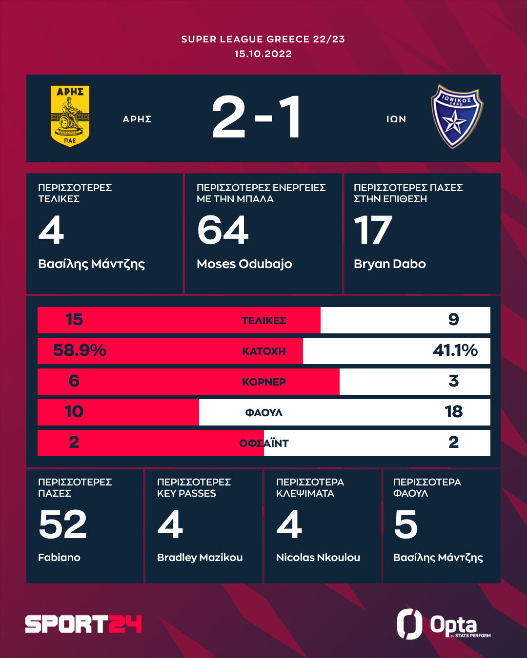 Ο Ιωνικός πήγε στο πρώτο μέρος με το υπέρ του προβάδισμα στο σκορ, χάρη στο τέρμα του Μάντζη στο 43', αλλά ο Άρης έφερε τούμπα το ματς με Ζερβινιό (63') και Γκρέι (74'). Επιστροφή στις νίκες για τους Θεσσαλονικείς, παραμένουν ουραγοί οι Νικαιώτες.