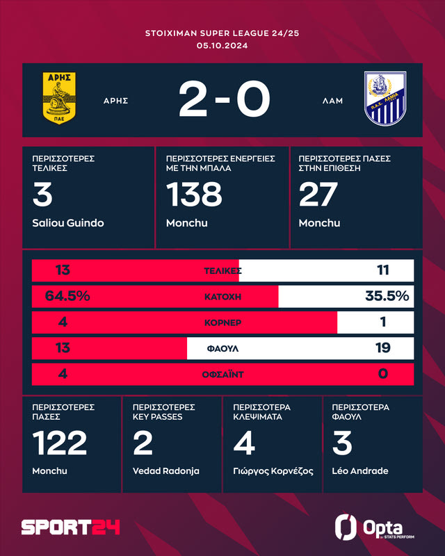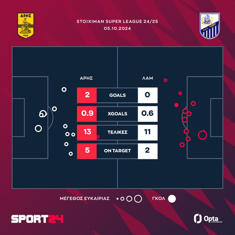 Στην κορυφή της Stoiximan Super League μαζί με την ΑΕΚ αναρριχήθηκε ο Άρης. Οι κίτρινοι, ορμώμενοι από τις νίκες τους με Ολυμπιακό και ΠΑΟΚ, καθάρισαν και τη Λαμία με 2-0 χάρη σε δύο γκολ του Λορέν Μορόν για την 7η αγωνιστική κάνοντας τρεις σερί νίκες στο πρωτάθλημα για πρώτη φορά από τον Μάιο του 2022.