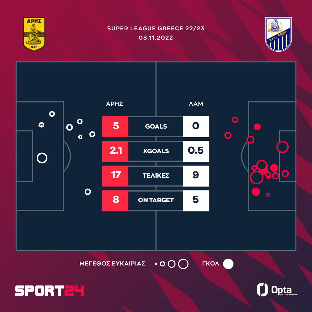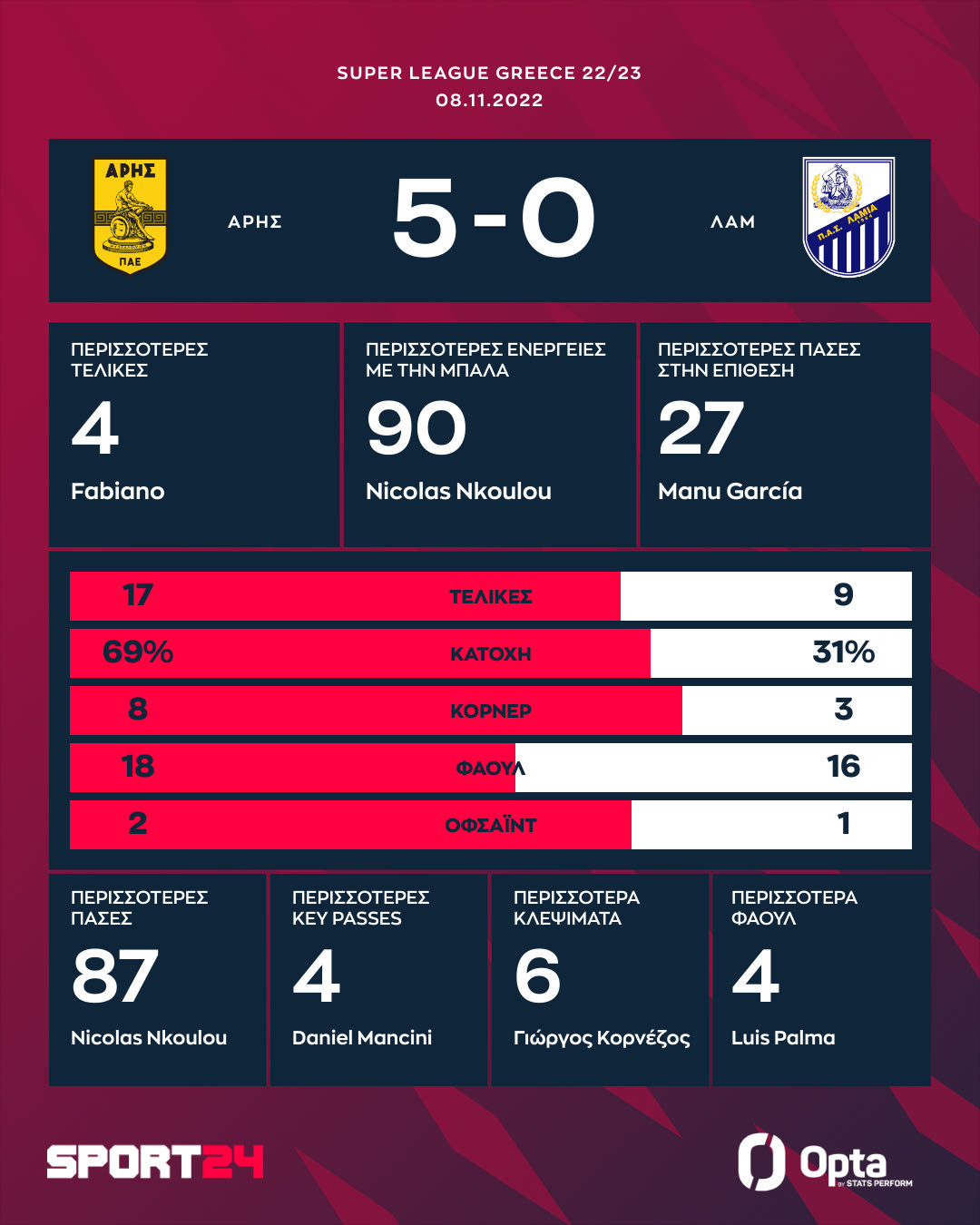 Με μεγάλο πρωταγωνιστή τον Πάλμα που πέτυχε χατ-τρικ και άξιους συμπαραστάτες τους Μαντσίνι, Ζερβινιό και Φαμπιάνο, ο Άρης συνέτριψε με 5-0 την Λαμία και επέστρεψε στις νίκες μετά από τρία ματς. Με 10 παίκτες από το 21ο λεπτό οι Φθιώτες.