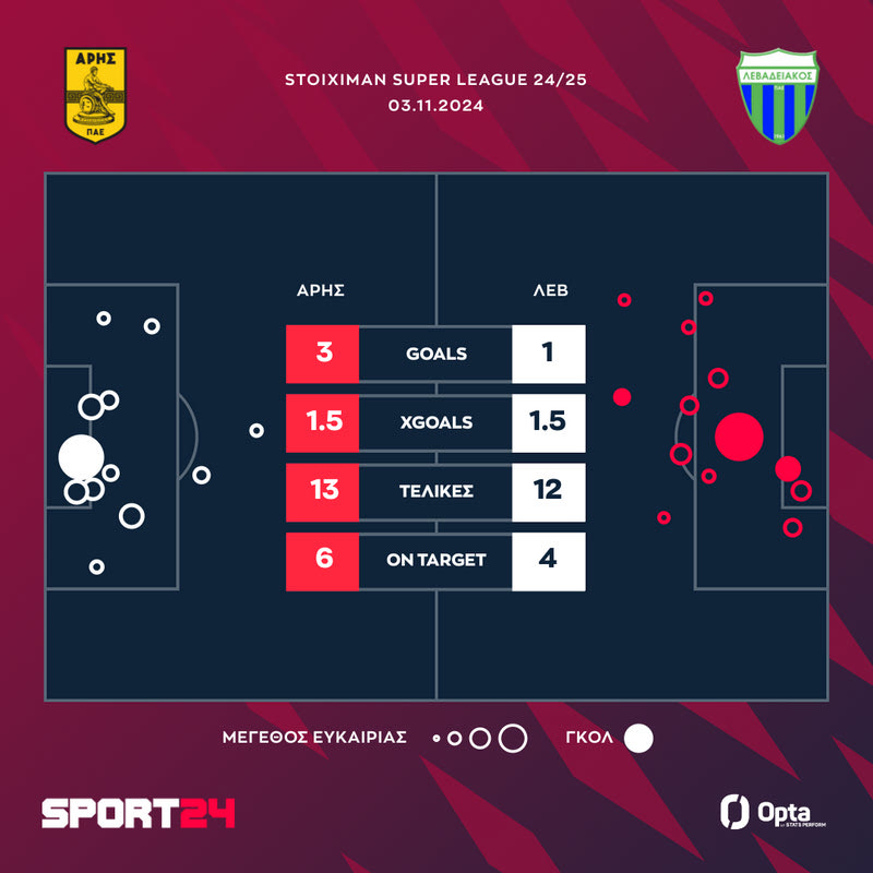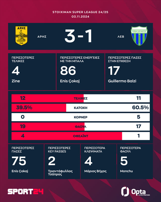 Έτσι ο Άρης ανέβηκε στους 21 βαθμούς, εξασφαλίζοντας πως θα περάσει ακόμη μια αγωνιστική στην κορυφή της βαθμολογίας ενώ ο Λεβαδειακός παρέμεινε στους 6 βαθμούς και χωρίς νίκη έπειτα από δέκα αγωνιστικές.
