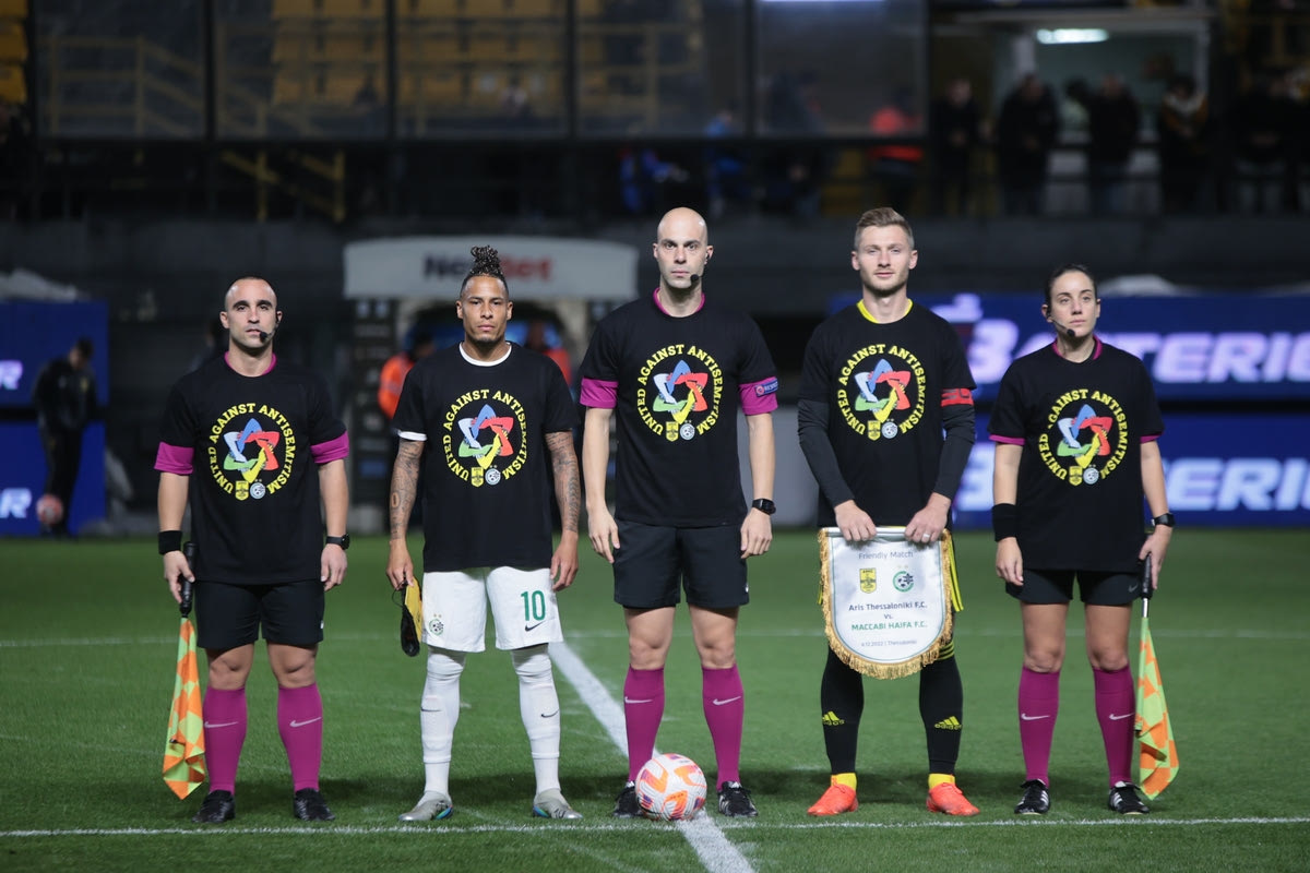 Οι παίκτες του Άρη και της Μακάμπι Χάιφα έκαναν την εμφάνισή τους στον αγωνιστικό χώρο με μπλουζάκια με μήνυμα κατά του αντισημιτισμού.