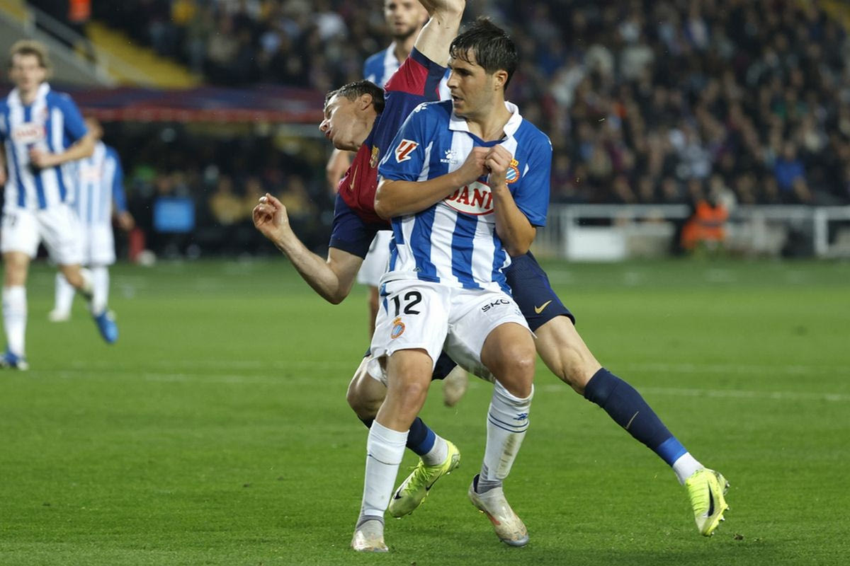 Barcelona's Robert Lewandowski heads the ball ahead of Espanyol's Alvaro Tejero during a Spanish La Liga soccer match between Barcelona and Espanyol at the Lluis Companys Olympic Stadium in Barcelona, Spain, Sunday, Nov. 3, 2024. (AP Photo/Joan Monfort)