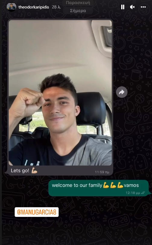 Όπως θα δείτε ο Καρυπίδης ανέβασε μια φωτογραφία που του έστειλε ο Μάνου Γκαρθία και εκείνος του απάντησε “Καλώς ήρθες στην οικογένειά μας. Πάμε”.