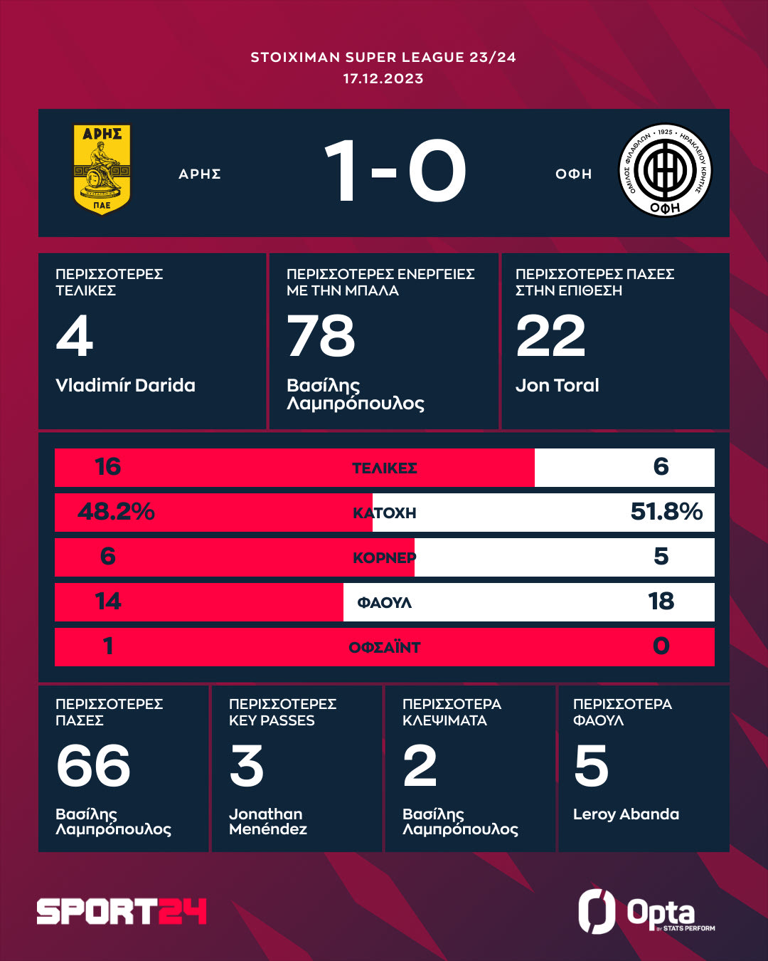 - ΟΦΗ: Μπάουμαν, Λάρσον, Βούρος, Λαμπρόπουλος, Θοράρινσον, Γκαγέγκος (79′ Γκλάζερ), Αμπάντα, Τοράλ (74′ Ριέρα), Νέιρα (65′ Φελίπε), Ντικό, Μοσκέρα (65′ Μπάκιτς)