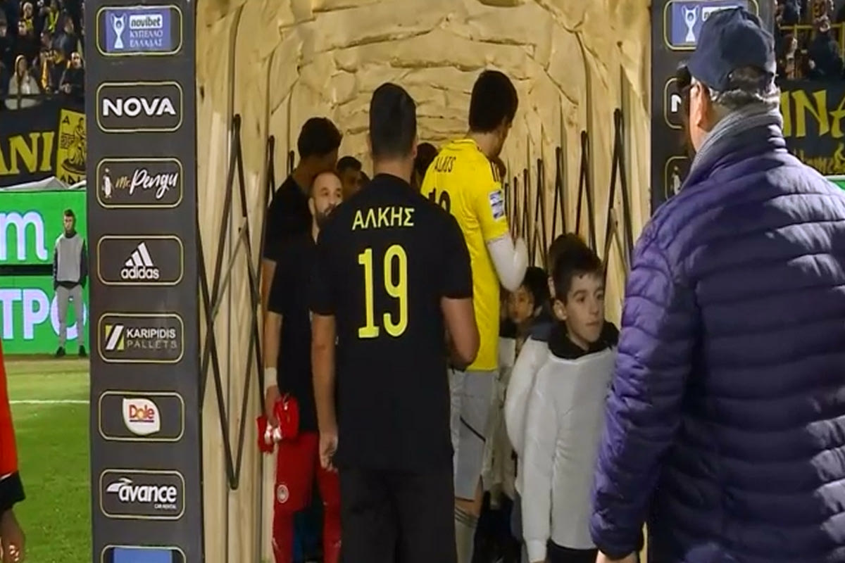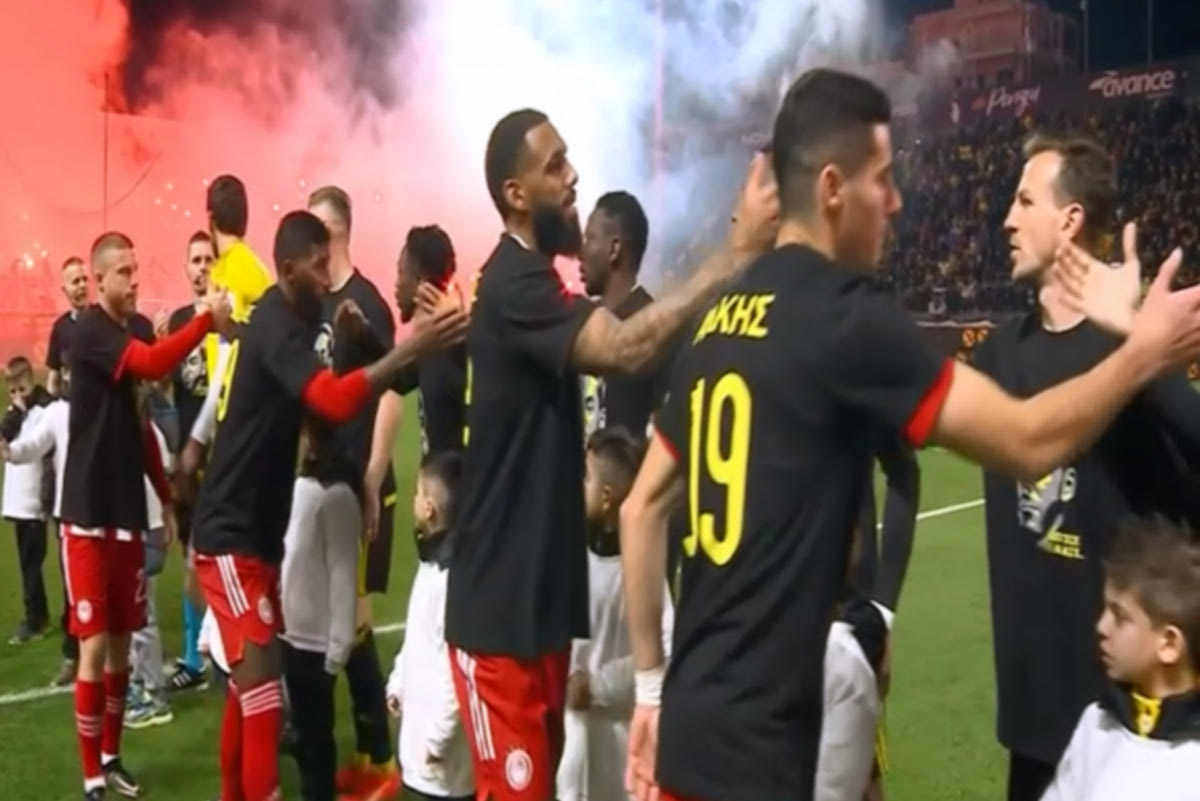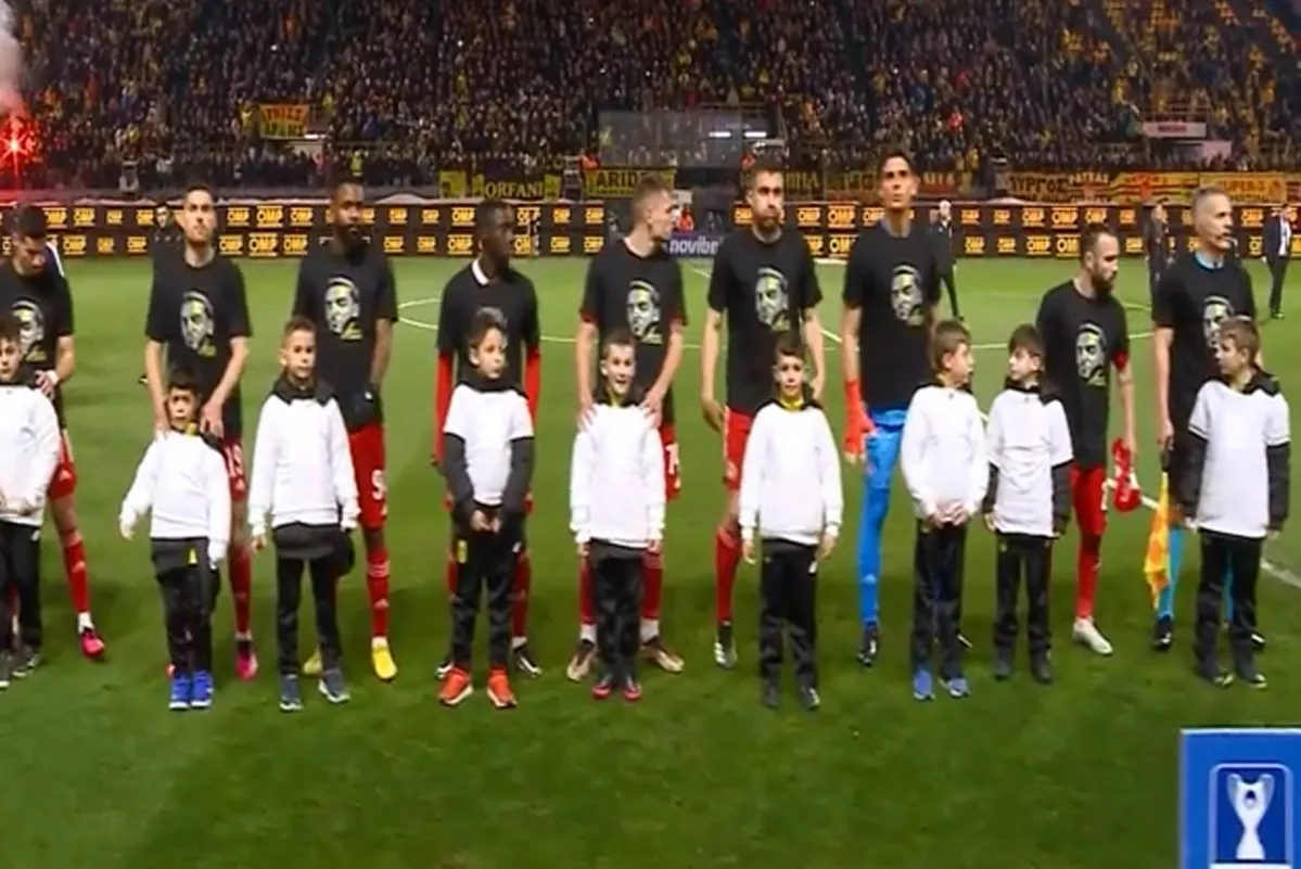 Οι ποδοσφαιριστές Άρη και Ολυμπιακού με μπλουζάκια στη μνήμη του Άλκη Καμπανού