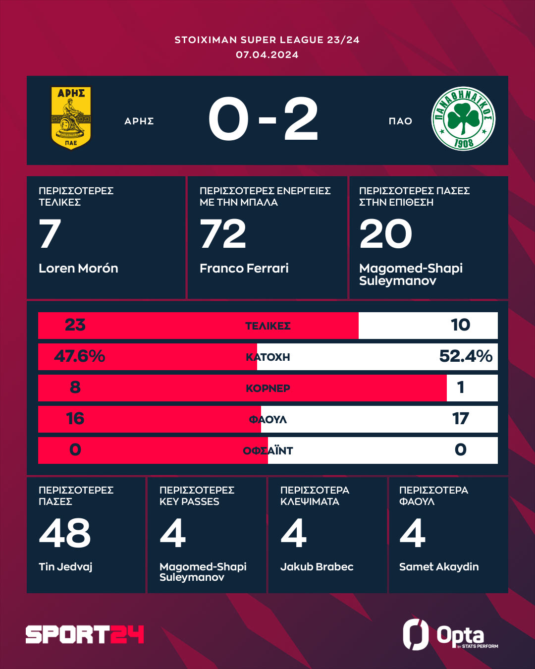 Με τον Σπόραρ να μπαίνει στο 46' και να πετυχαίνει ένα πανέμορφο γκολ στο 62' και τον Μπράμπετς να σημειώνει αυτογκόλ στο 90+2', ο Παναθηναϊκός επιβλήθηκε 2-0 του Άρη στο "Βικελίδης" και έμεινε ζωντανός στη μάχη του τίτλου στην Stoiximan Super League.