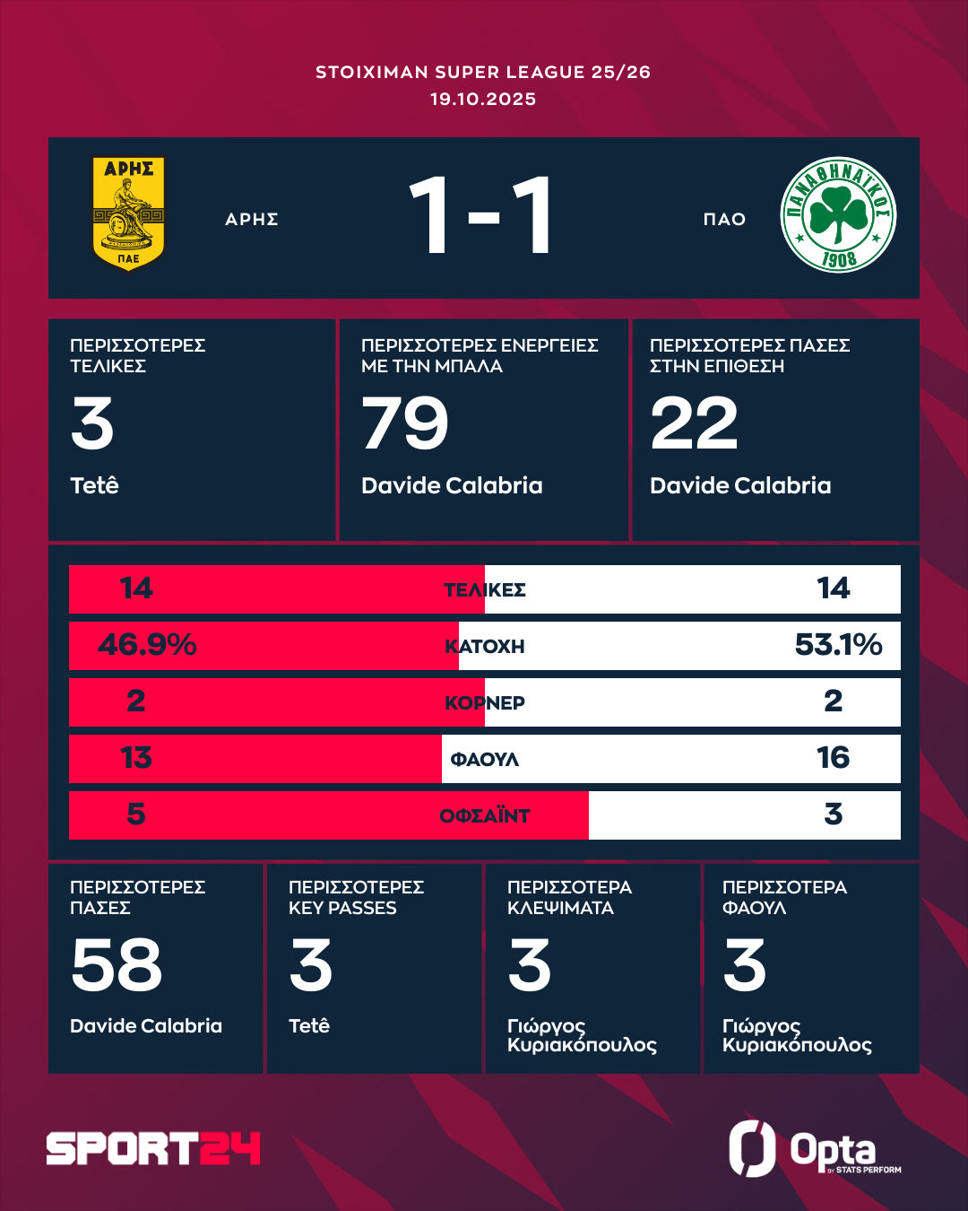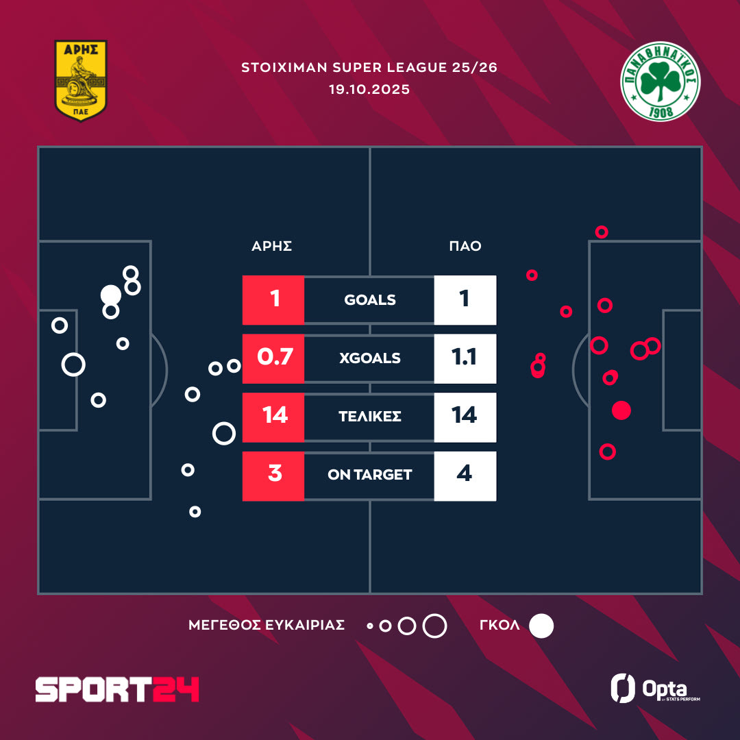 Ο Παναθηναϊκός προηγήθηκε μόλις στο 3ο λεπτό με τον Σβιντέρσκι όμως δεν μπόρεσε να καθαρίσει το ματς στο Βικελίδης, με τον Άρη να μην πετάει λευκή πετσέτα και να αρπάζει το βαθμό της ισοπαλίας στο 75′ με τον Δώνη και το ολέθριο λάθος του Σβιντέρσκι.