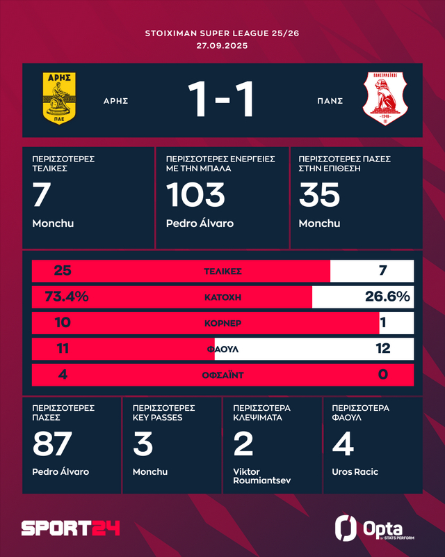 Την πρώτη του απώλεια με τον Μανόλο Χιμένεθ στον πάγκο του, έπειτα από τέσσερις νίκες, κατέγραψε ο Άρης, ο οποίος έμεινε στο 1-1 με τον Πανσερραϊκό στο “Κλεάνθης Βικελίδης” για την 5η αγωνιστική της Stoiximan Super League.