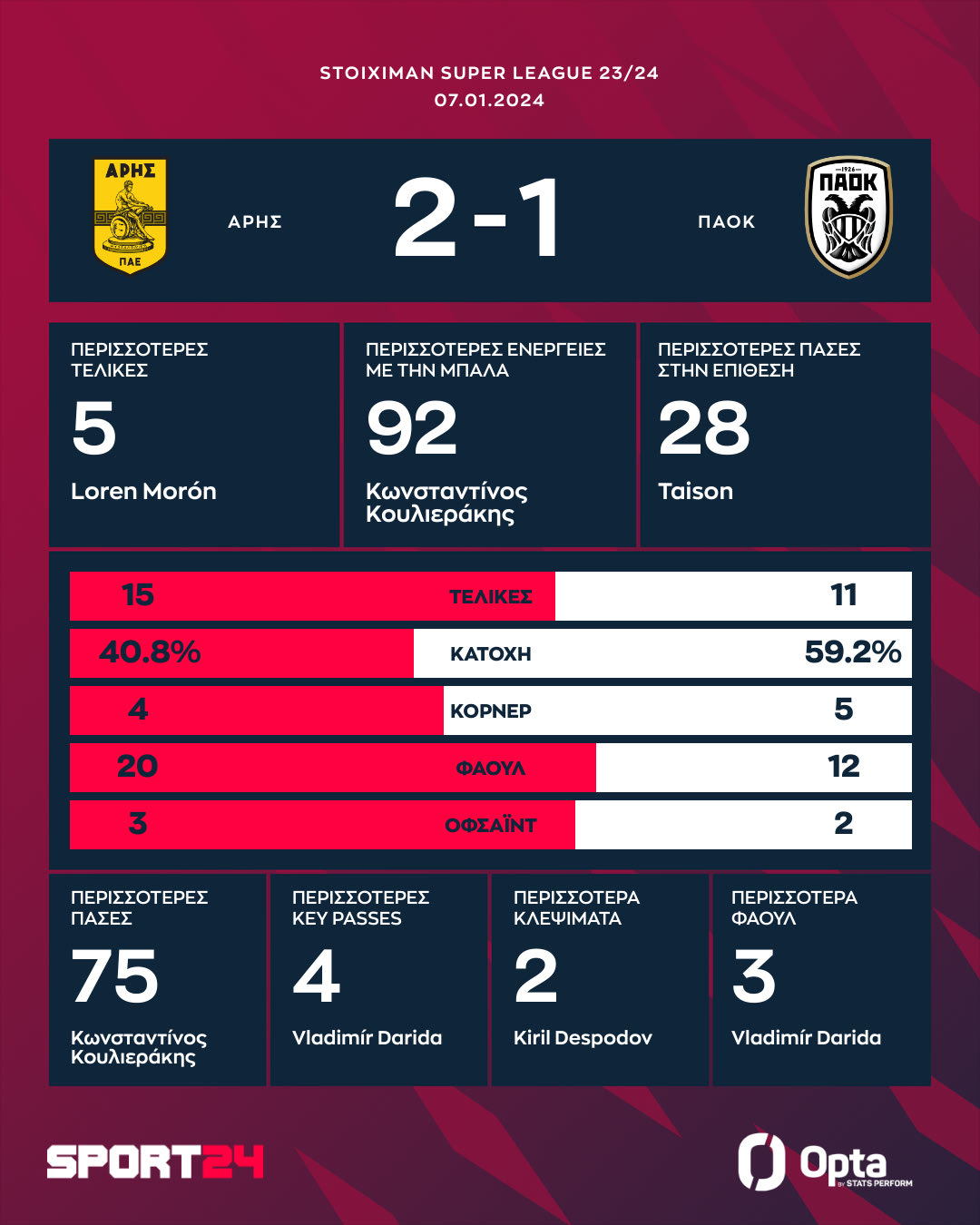 Μετά από ένα εξαιρετικό δεύτερο 45 λέπτο όπου ο Άρης σκόραρε στην πρώτη του τελική οι κιτρινόμαυροι που έδειξαν περισσότερο παθιασμένοι στην αναμέτρηση και είχαν την ουσία σε σχέση με τον ΠΑΟΚ πήραν το ντέρμπι της Θεσσαλονίκης και γκρέμισαν τον δικέφαλο από την κορυφή με τον Παναθηναϊκό να είναι μόνος πρώτος πλέον στο +2.