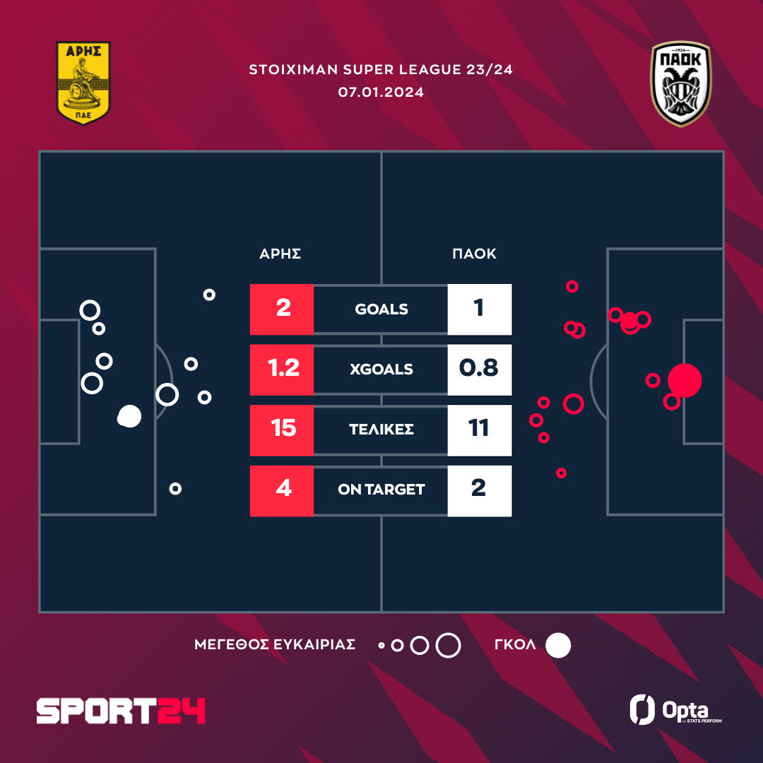 Είναι χαρακτηριστικό πως το πρώτο 45λεπτοι ολοκληρώθηκε με δέκα τελικές, πέντε για κάθε ομάδα αλλά καμία εκ των δέκα στην εστία με τον Άρη να έχει 0,3xgoals και τον ΠΑΟΚ 0,2xgoals.