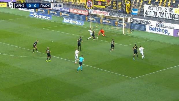 Στο 6ο λεπτό της αναμέτρησης ανάμεσα στον Άρη και τον ΠΑΟΚ στο Κλεάνθης Βικελίδης ο Δικέφαλος άνοιξε το σκορ. Έπειτα από μία βαθιά μπαλιά, ο Σβιντέρσκι πάτησε στην περιοχή από τα δεξιά, σύγκλινε και με έξυπνο τρόπο βρήκε τον Σβαμπ, ο οποίος τσίμπησε την μπάλα δίνοντας μάχη με τον Σάκιτς και έτσι έγραψε το 0-1.