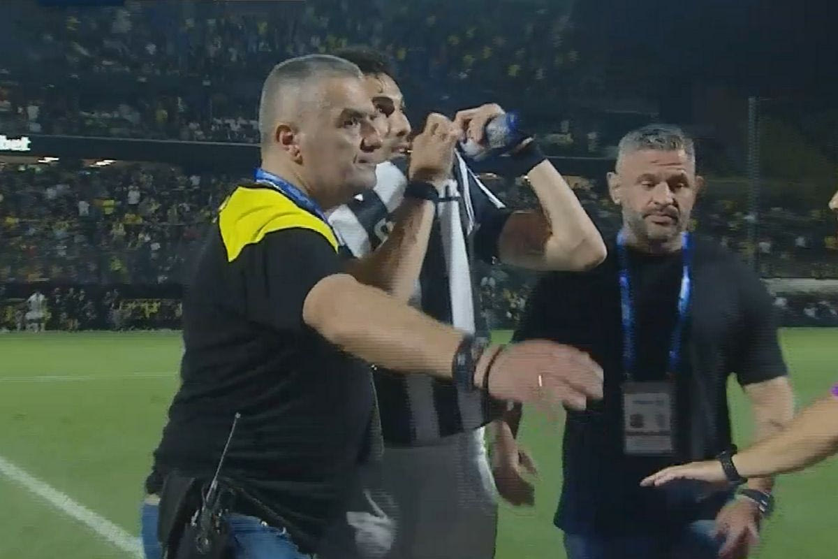 Ο Μιχαηλίδης έδειξε το σήμα του ΠΑΟΚ κατά την αποχώρησή του του από τον αγωνιστικό χώρο.
