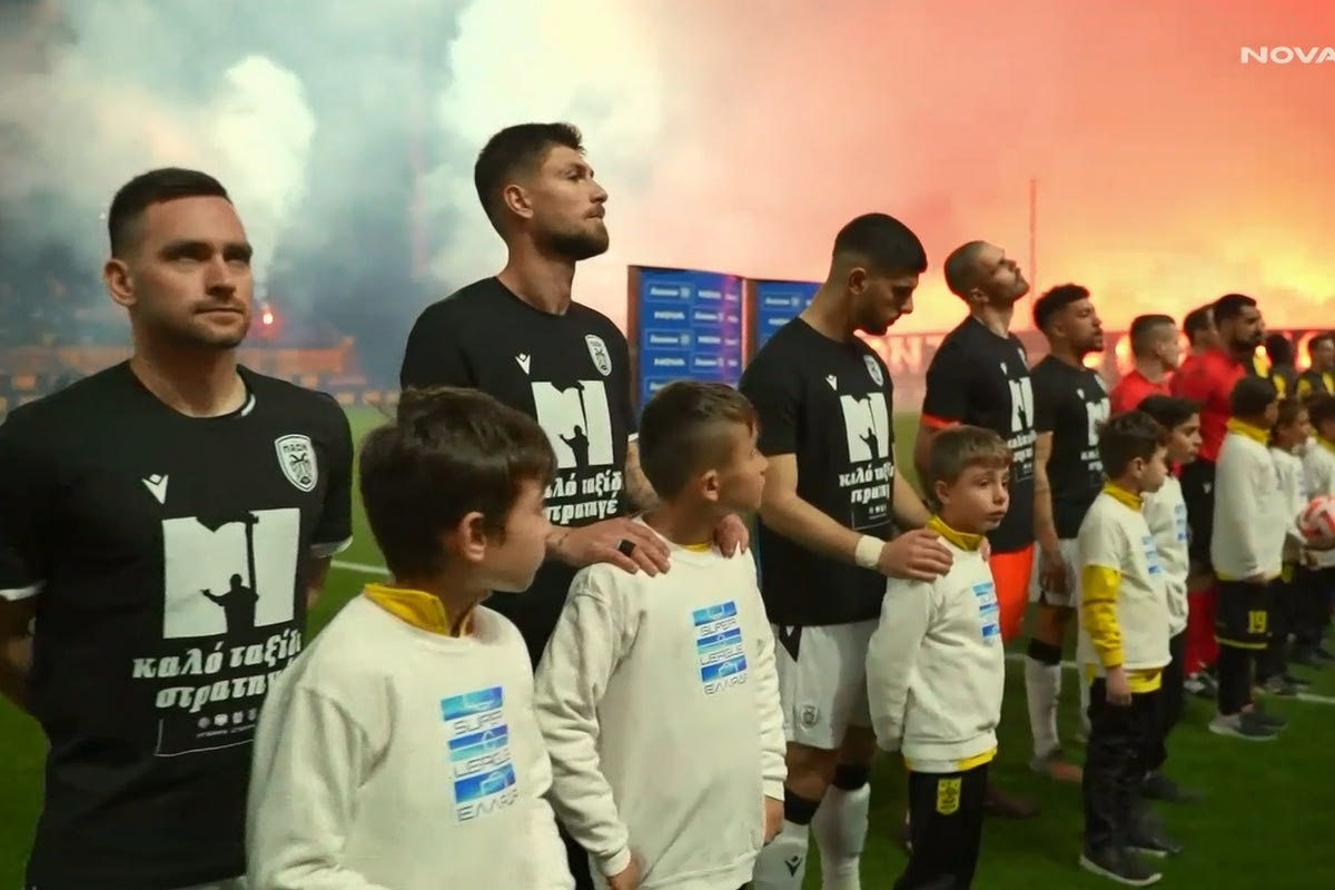 Οι ποδοσφαιριστές της ομάδας της Θεσσαλονίκης έκαναν την εμφάνιση τους στο “Κλεάνθης Βικελίδης” με μαύρες μπλούζες με την εικόνα ενός οπαδού και την ατάκα “καλό ταξίδι στρατηγέ”.