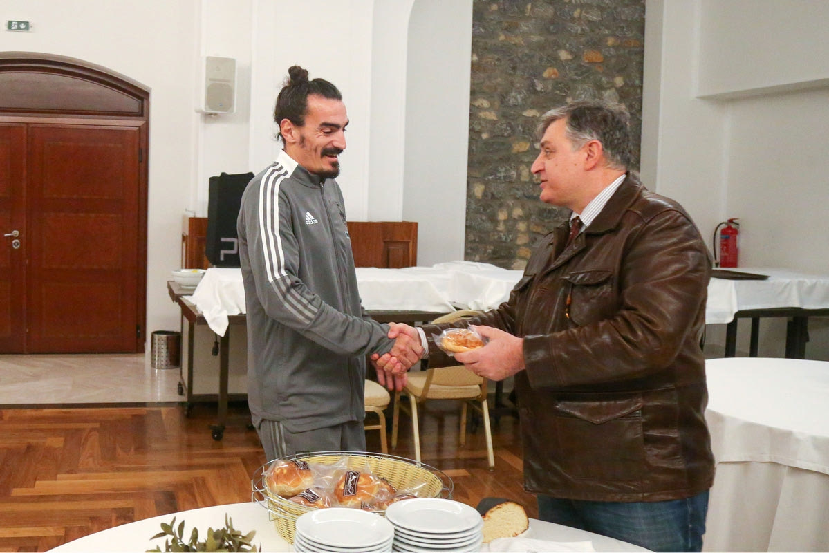 Ο Θεόδωρος Καρυπίδης έδωσε το "παρών" στην κοπή πίτας της ΠΑΕ Άρης, στο ξενοδοχείο που κατέλυσε η αποστολή για το παιχνίδι με τον Παναθηναϊκό.