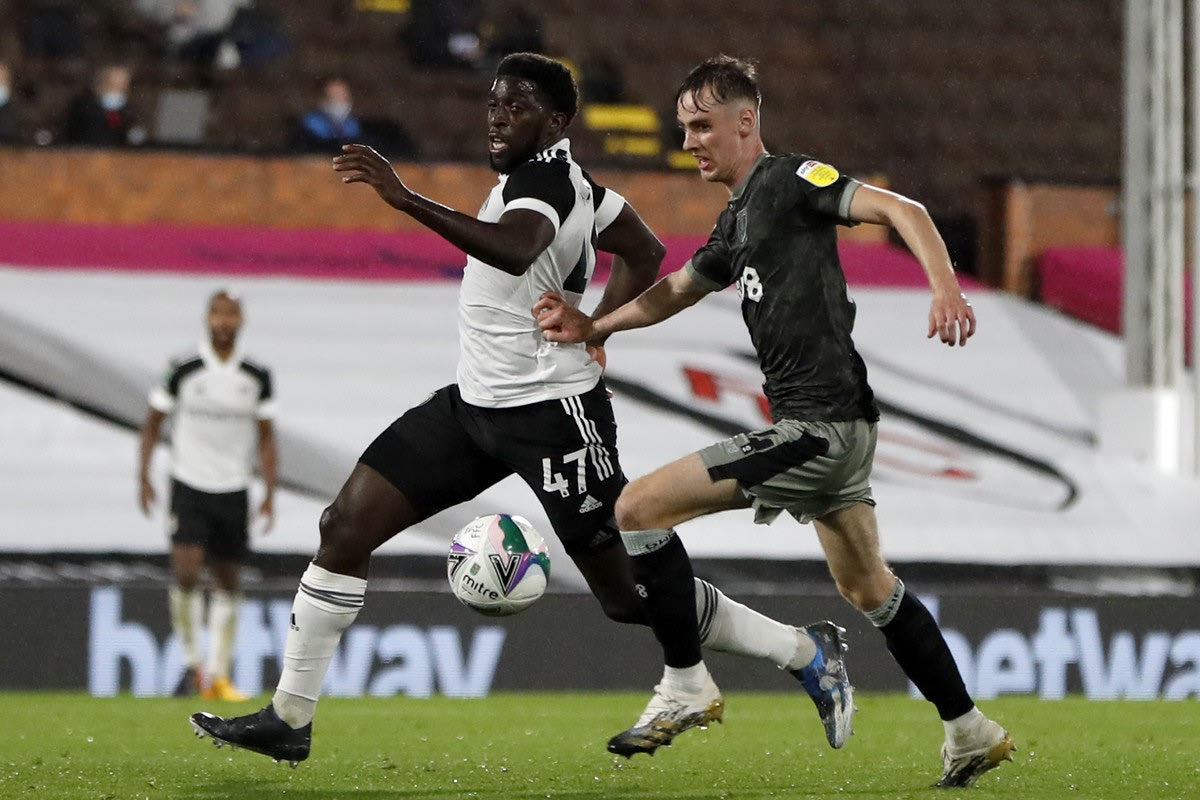 Fulham's Aboubakar Kamara, left, duels for the ball with Sheffield Wednesday's Ciaran Brennan during the English League Cup soccer match between Fulham and Sheffield Wednesday at the Craven Cottage stadium in London, Wednesday, Sept. 23, 2020. (Paul Childs/Pool via AP) AP