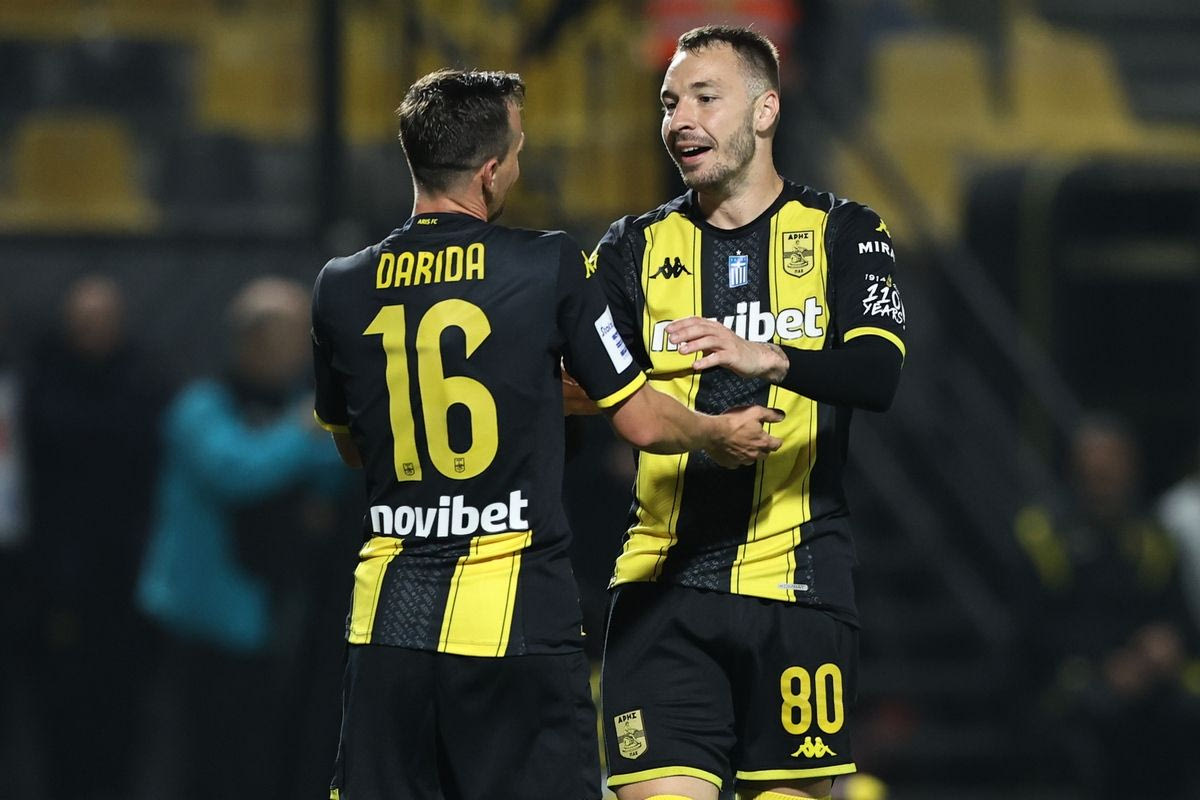 Ο Μορόν πανηγυρίζει με τον Νταρίνα το γκολ του στο Άρης - Λαμία