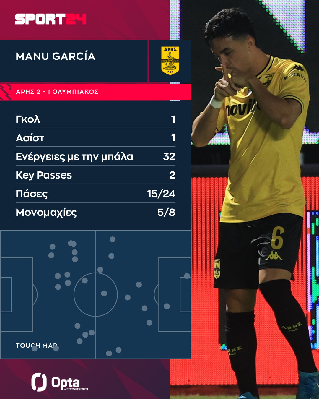 Ο Μάνου Γκαρθία στα 76 λεπτά που αγωνίστηκε είχε 32 ενέργειες με την μπάλα, σε όλο το μήκος και το πλάτος του αγωνιστικού χώρου. Ήταν δραστήριος πάνω από τη σέντρα, με δύο ενέργειες στην αντίπαλη περιοχή, ενώ αρκετές φορές γύρισε και πίσω, με τον Άρη να είναι καλά στημένος στα μετόπισθεν σε μεγάλο μέρος του παιχνιδιού.