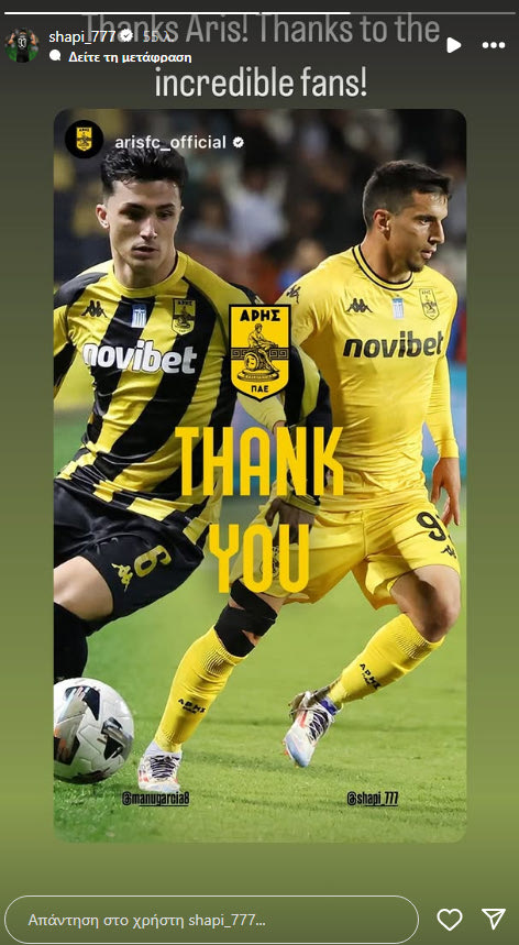 Πιο λιτό ήταν το μήνυμα του Σάπι Σουλεϊμάνοφ, ο οποίος με ένα story στον λογαριασμό του στο Instagram. “Ευχαριστώ Άρη, ευχαριστώ στους απίστευτους οπαδούς“, αναφέρει το μήνυμα του Ρώσου μεσοεπιθετικού.