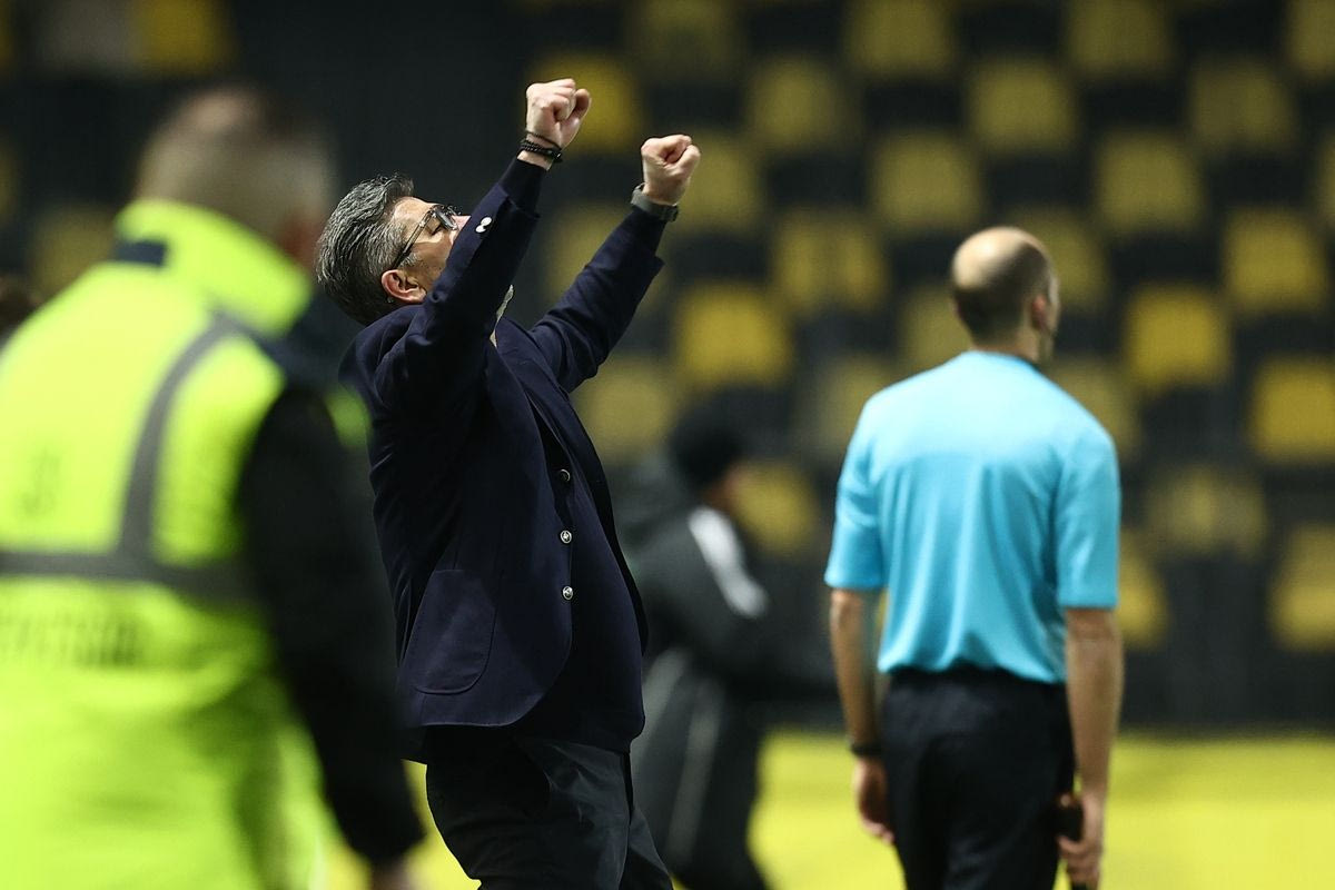 Ο Μαρίνος Ουζουνίδης ξεσπάει σε πανηγυρισμούς μετά τη λήξη του ματς κόντρα στον Παναθηναϊκό