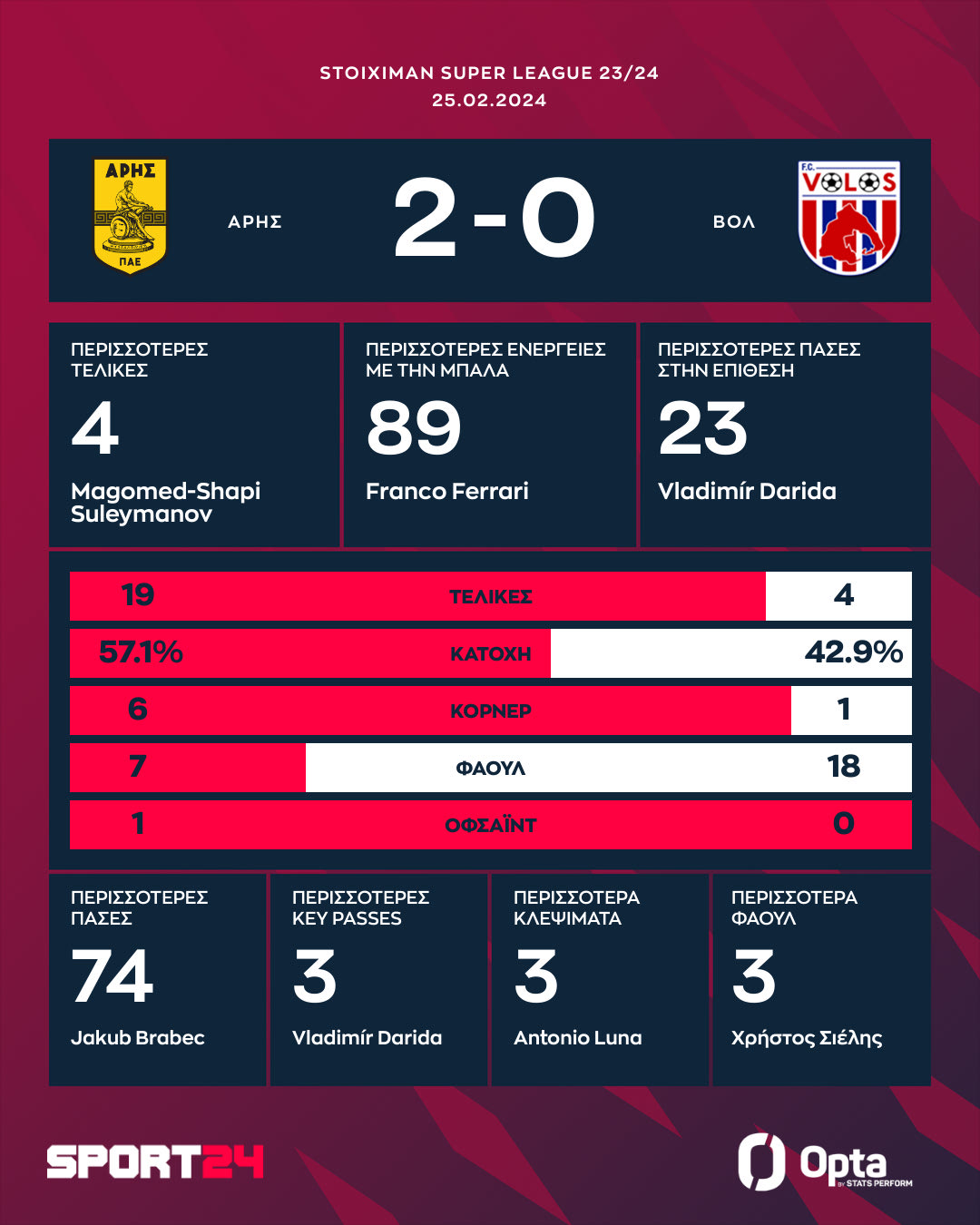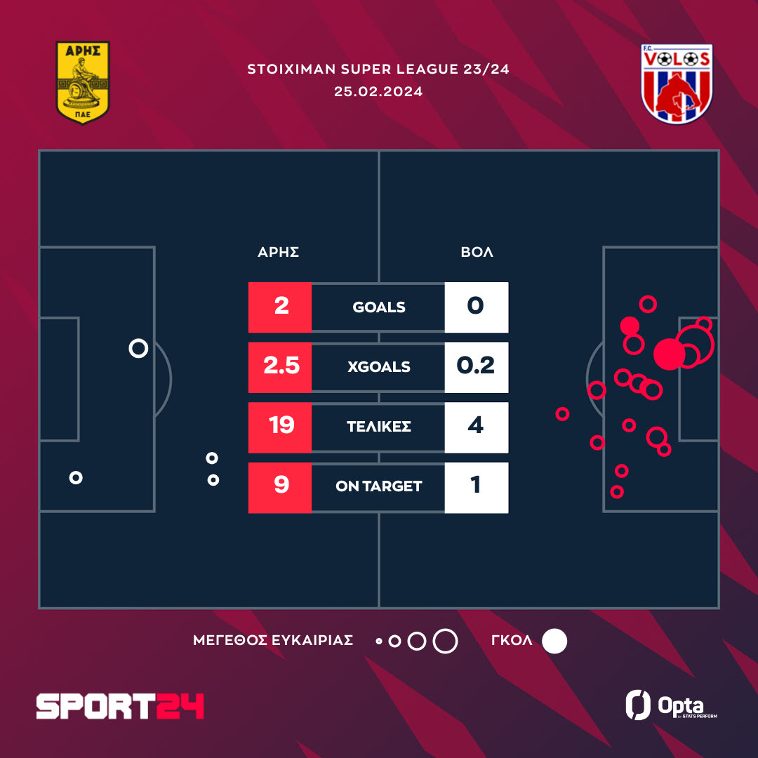 Ο Άρης έφτασε τους 41 βαθμούς στην πέμπτη θέση, ενώ ο Βόλος παρέμεινε στους 17 και κάτω από τη ζώνη του υποβιβασμού καθώς μειονεκτεί στην ισοβαθμία από τον ΠΑΣ.