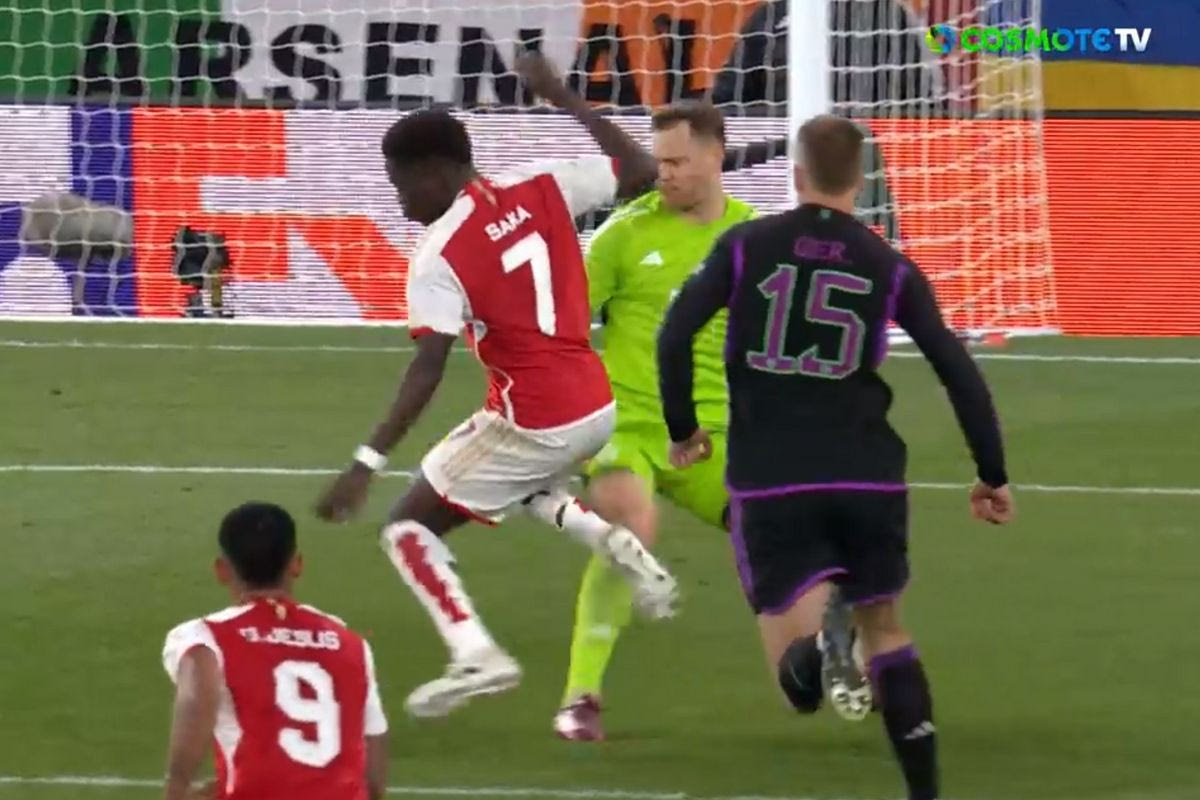 Ο Μπουκαγιό Σακά διαμαρτυρήθηκε για πέναλτι έπειτα από επαφή του με τον Νόιερ στην περιοχή στο 90+5' της αναμέτρησης ανάμεσα στην Άρσεναλ και την Μπάγερν.