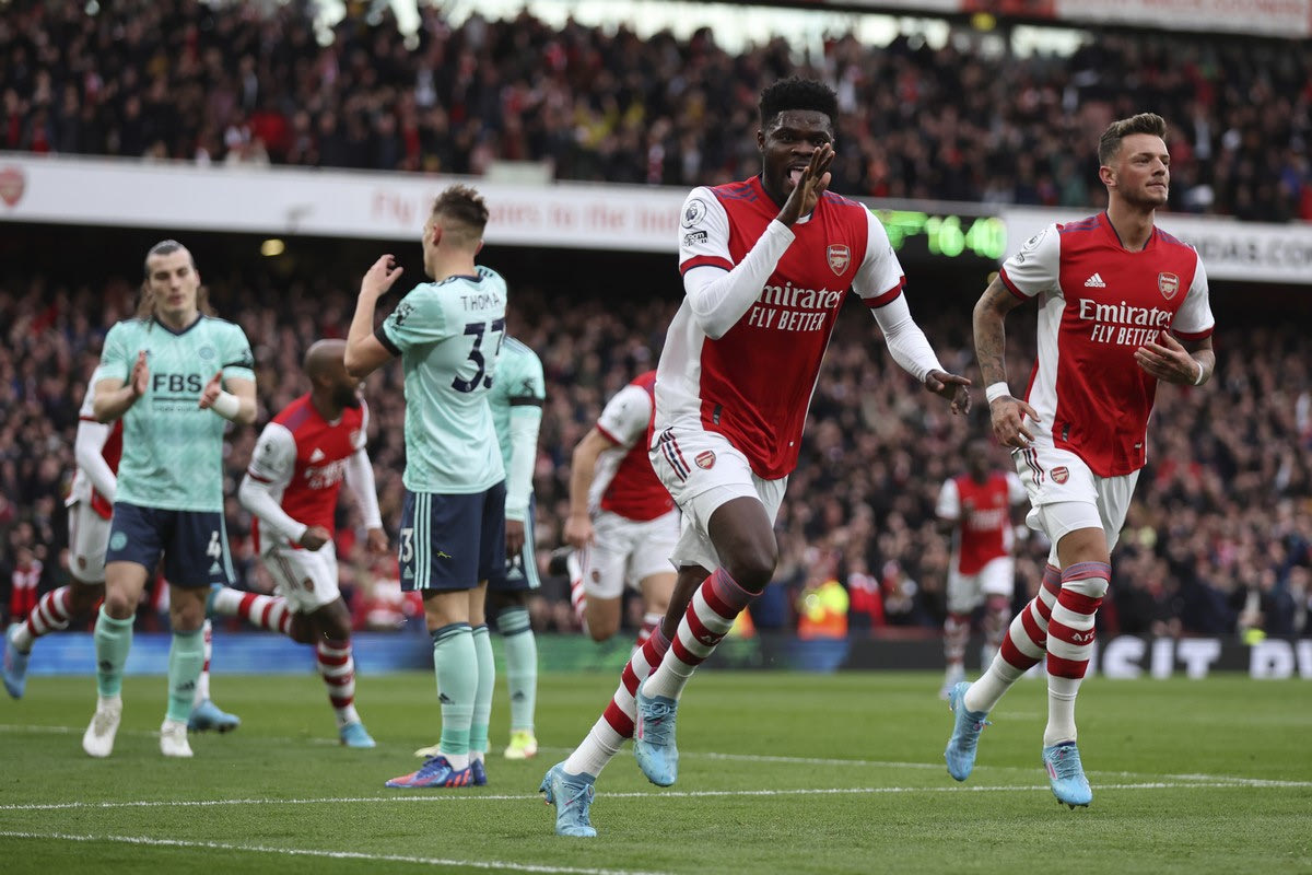 Ο Τόμας Παρτέι πανηγυρίζει γκολ της Άρσεναλ κόντρα στην Λέστερ για την Premier League | 13 Μαρτίου 2022 @2022 Ian Walton/AP IMAGES