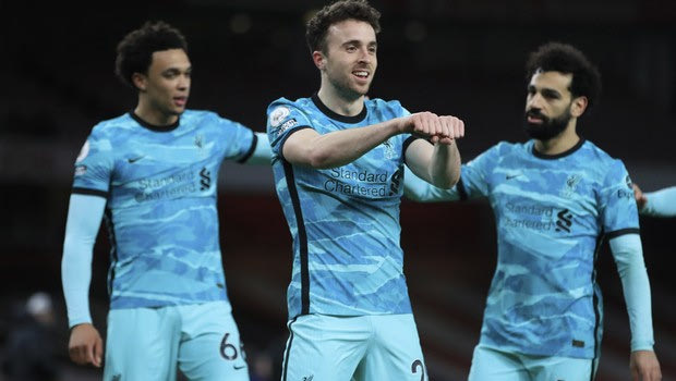 Ο Ντιόγκο Ζότα πανηγυρίζει γκολ του κόντρα στην Άρσεναλ με τη φανέλα της Λίβερπουλ σε ματς της Premier League @ 2021 Adam Davy/Associated Press