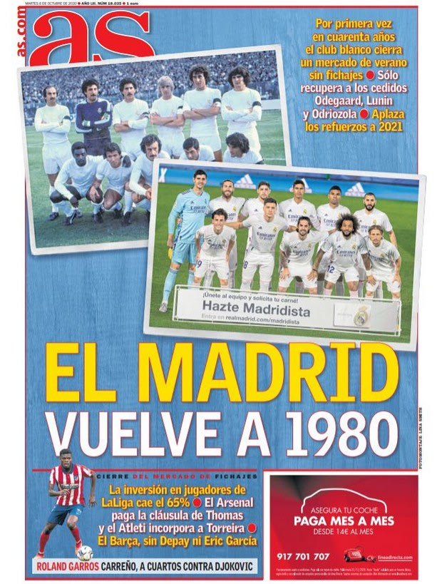Έτσι, η ισπανική εφημερίδα AS ασχολείται με αυτό το γεγονός, έχει σε φωτογραφία τις ομάδες της Ρεάλ Μαδρίτης του 1980 και του 2020 και αναφέρει: “Η Ρεάλ Μαδρίτης επέστρεψε στο 1980”.