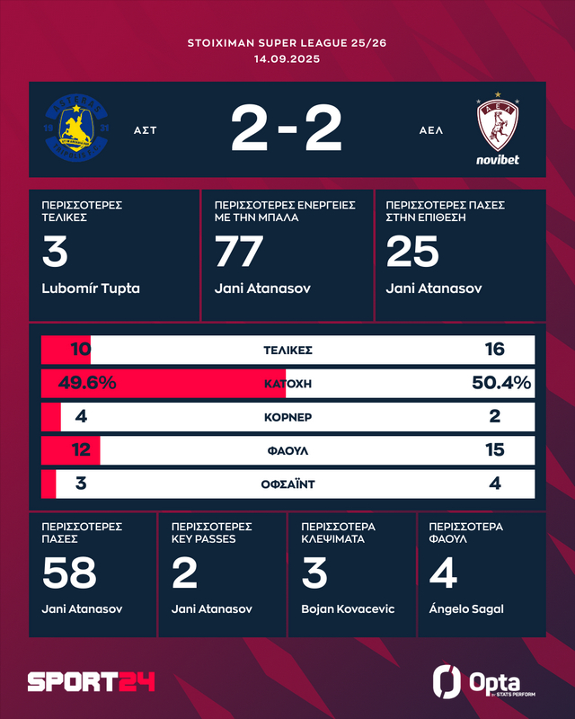 Με τον Πασά πρωταγωνιστή και αντεπίθεση στο δεύτερο μέρος, η ΑΕΛ Novibet επέστρεψε από το 2-0 και έφυγε με το 2-2 από την Τρίπολη κόντρα στον Αστέρα AKTOR για την 3η αγωνιστική της Stoiximan Super League.