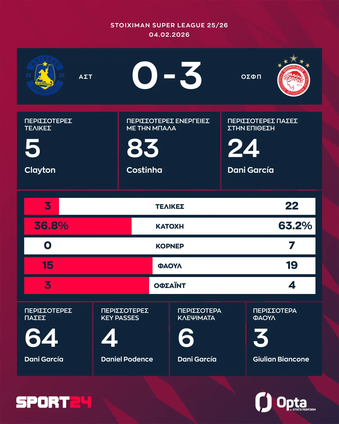 Ντεμπούτο για τον Ολυμπιακό έκανε ο Κλέιτον, ο οποίος μάλιστα ήταν και αρκετά δραστήριος. Στη βαθμολογία, οι ερυθρόλευκοι είναι στην πρώτη θέση με 46 πόντους. Οι Αρκάδες παρέμειναν στους 13 βαθμούς και βρίσκονται στην προτελευταία θέση.