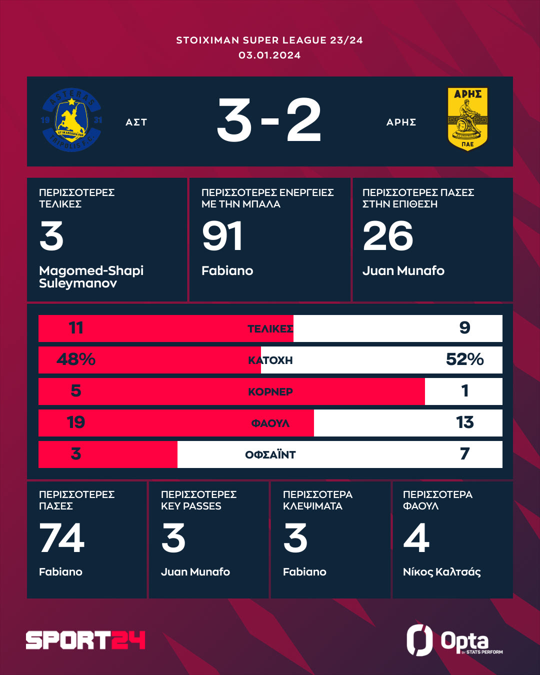Ο Αστέρας γύρισε τούμπα το ματς με τον Άρη από το 2-0 στο 14' και επικράτησε στο τέλος με 3-2 με δύο γκολ του Μιριτέλο και ένα του αειθαλή Μουνάφο. Οι Αρκάδες εδραιώνονται στην εξάδα και πλησίασαν τους κίτρινους στον ένα βαθμό.