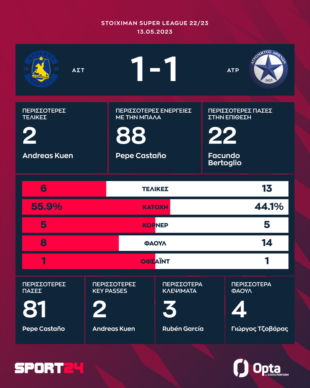 Με ισοπαλία τελείωσαν τις υποχρεώσεις τους στη Stoiximan Super League ο Αστέρας και ο Ατρόμητος, με τη μεταξύ τους αναμέτρηση να λήγει 1-1. Ο Κωστέας άνοιξε το σκορ στο 43', ισοφάρισε ο Κουέν στο 54'.