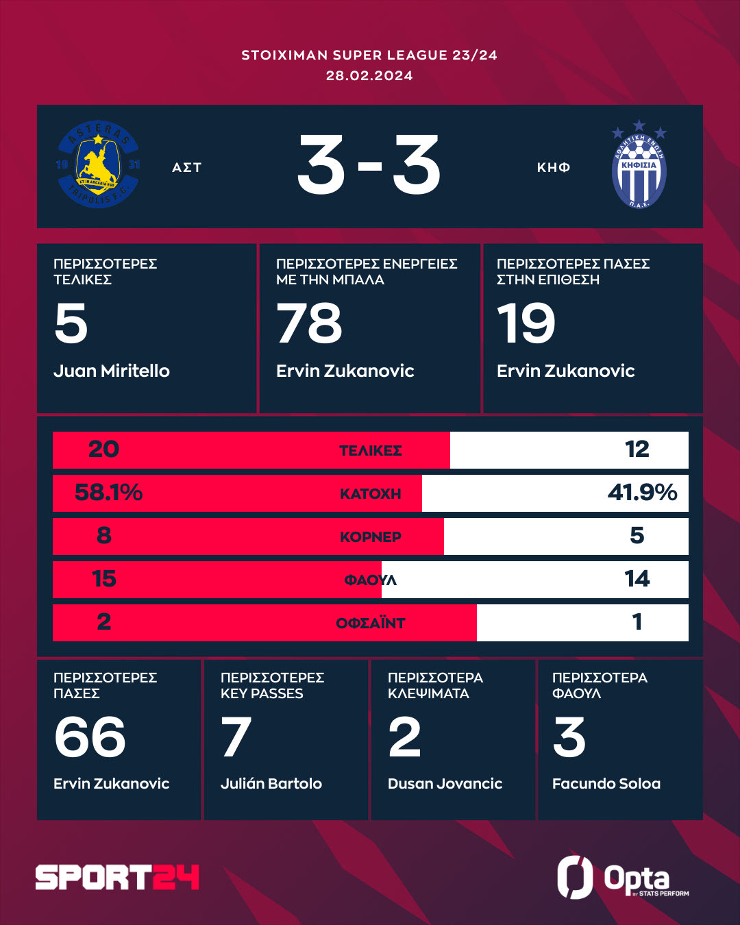 Η στατιστική απεικόνιση στην αναμέτρηση του Αστέρα με την Κηφισιά για την Stoiximan Super League OPTA