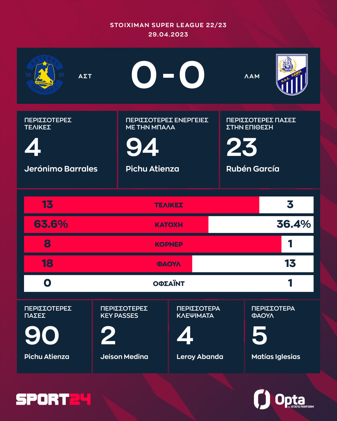 - ΑΣΤΕΡΑΣ: Τσιφτσής, Γκαρσία, Ατιένθα, Καστάνο, Άλβαρες, Μουνάφο, Ιγκλέσιας, Κρέσπι, Τιλίκα (90′ Μπερτόγλιο), Μπαρτόλο, Μπαράλες (90′ Κωστέας)