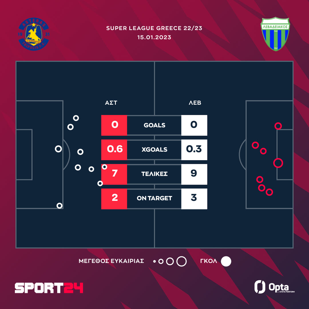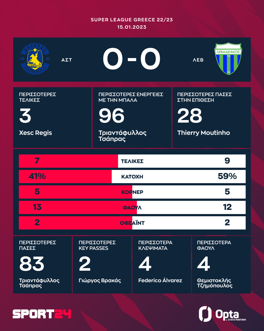 Ισόπαλο δίχως τέρματα (0-0) έληξε το παιχνίδι της Τρίπολης ανάμεσα στον Αστέρα και τον Λεβαδειακό. Οι γηπεδούχοι του Άκη Μάντζιου που έπαιζαν με δέκα παίκτες από το 24′ εξαιτίας της αποβολής του Ριέρα με δεύτερη κίτρινη είχαν περισσότερες ευκαιρίες για να ανοίξει το σκορ, ιδίως στο πρώτο 45λεπτο αλλά δεν τα κατάφεραν.