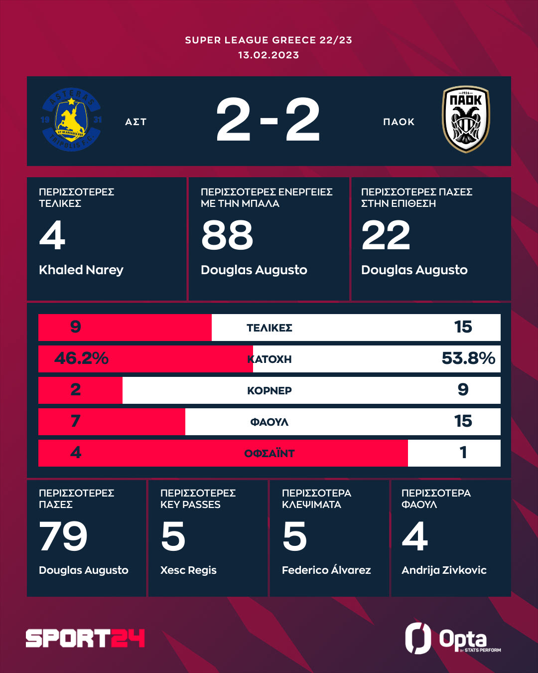 Τα στατιστικά και οι κορυφαίες επιδόσεις στο Αστέρας - ΠΑΟΚ OPTA/SPORT24