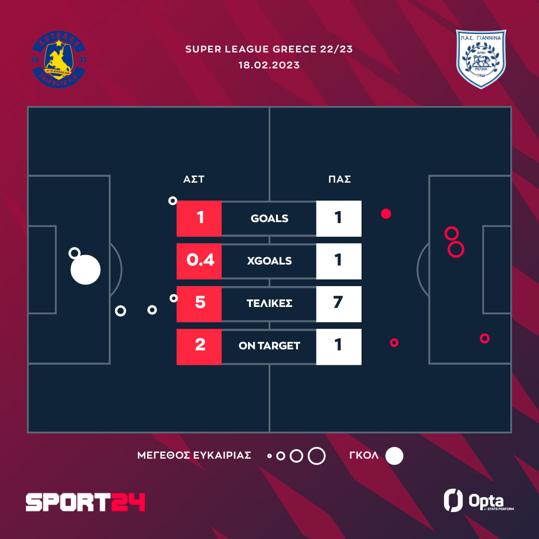 Ο Ριέρα άνοιξε το σκορ στο 2ο λεπτό με απευθείας εκτέλεση φάουλ, ενώ ο Ροντρίγκο Εραμούσπε έφτασε στην ισοφάριση στο 37′ από την άσπρη βούλα. Κάπως έτσι, οι Αρκάδες είναι στην 8η θέση με 24 πόντους, ενώ οι Ηπειρώτες είναι 11οι με 22.