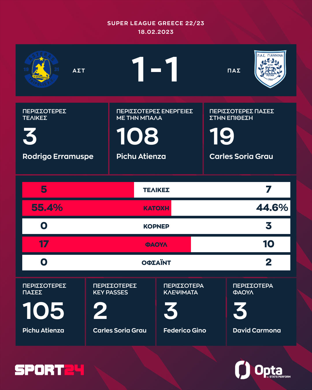 Στην ισοπαλία περιορίστηκαν ο Αστέρας και ο ΠΑΣ Γιάννινα (1-1) για την 23η αγωνιστική της Stoiximan Super League. Ο Ριέρα άνοιξε το σκορ στο 2' με εκπληκτικό γκολ και ο Εραμούσπε απάντησε από την άσπρη βούλα στο 37'.