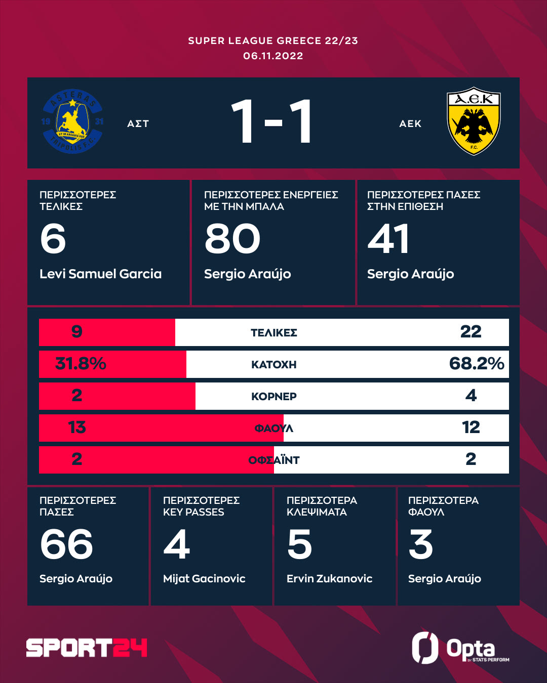 Στο Θεόδωρος Κολοκοτρώνης σταμάτησε το σερί της ΑΕΚ, η οποία αναδείχθηκε ισόπαλη 1-1 με τον Αστέρα. Ο Άμραμπατ άνοιξε το σκορ στο 52' με εύστοχο χτύπημα πέναλτι, ενώ ο Κρεσπί διαμόρφωσε το τελικό σκορ στο 58'.